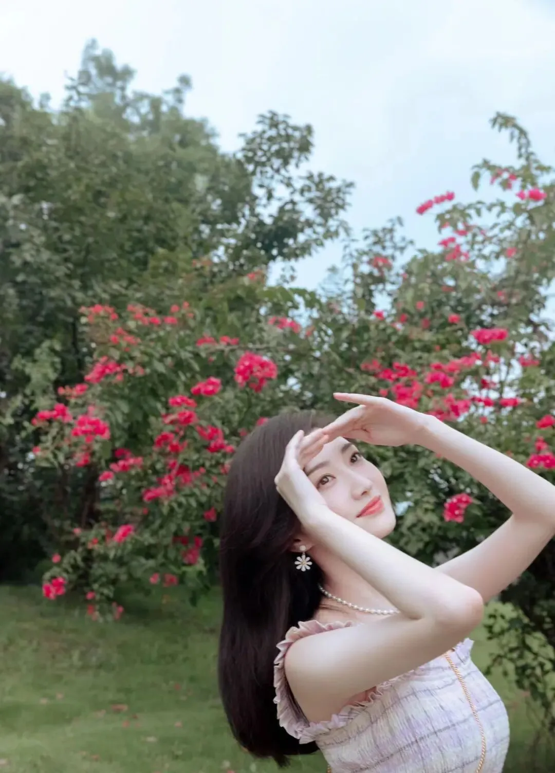 在花园或者户外拍照时,双手可以抬起来,一前一后放在额头上方,像是在挡阳光一样,动作一定要轻,头稍微仰一点,脸朝上找角度,眼神可以看镜头,也可以看天空方向,这个姿势很适合修饰手臂线条,还能让脸显得更小更精致,肩颈也会更舒展,整体气质偏灵动甜美,照片一眼看上去就很有氛围感