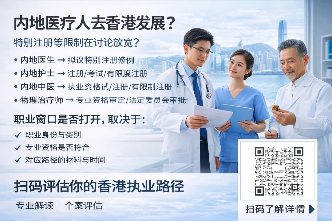 注:医生特别注册相关调整目前属拟议修例方向,最终以香港最新法例、相关管理局及雇主要求为准;护士、中医、物理治疗等职业适用不同制度,需个案评估。