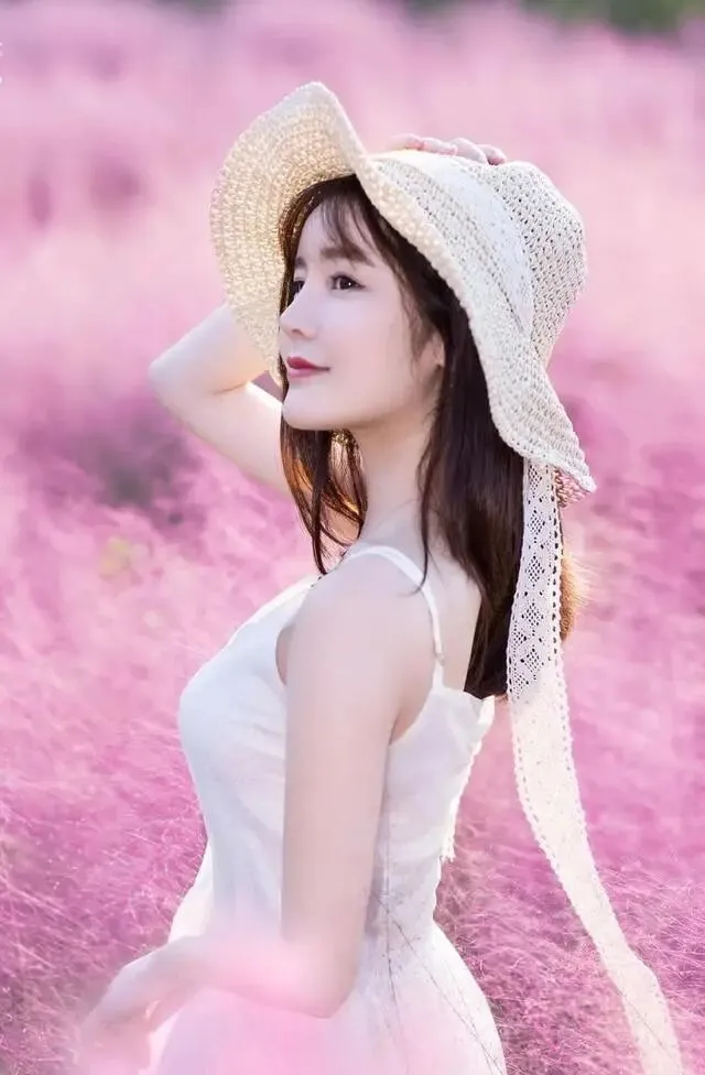 如果带了草帽,一只手扶住帽檐,另一只手自然垂下或者放在身后,动作立刻就有了重点,身体保持侧身,脸微微转向镜头,嘴角带一点点笑意就够了,这个姿势会让脸部线条更柔和,侧颜看起来很精致,也能顺带修饰手臂和肩颈,整张照片会有一种温柔少女感,很适合粉黛这种软软的场景,