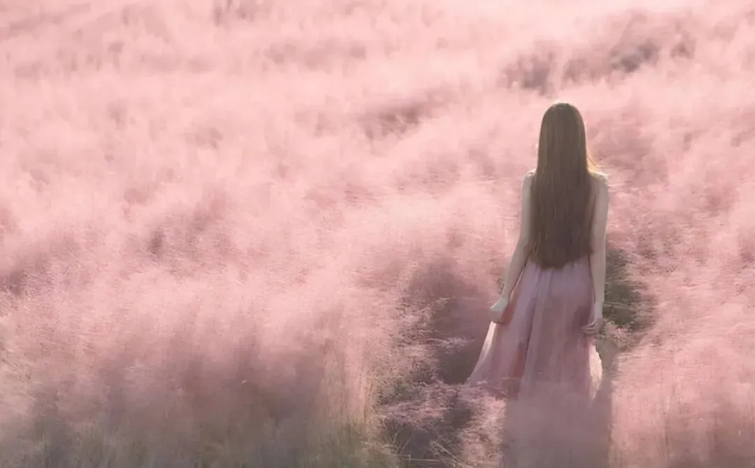 背影照真的很适合拍粉黛草,尤其是长发和长裙的组合,看起来特别有故事感,拍的时候背对镜头慢慢往前走,两只手轻轻拎一点裙摆,不要走太快,动作轻一点就行,这样可以让背影线条更流畅,裙摆也会显得灵动,人会显高显瘦不少,画面有种安静又浪漫的松弛感,很像误入粉色梦境里,