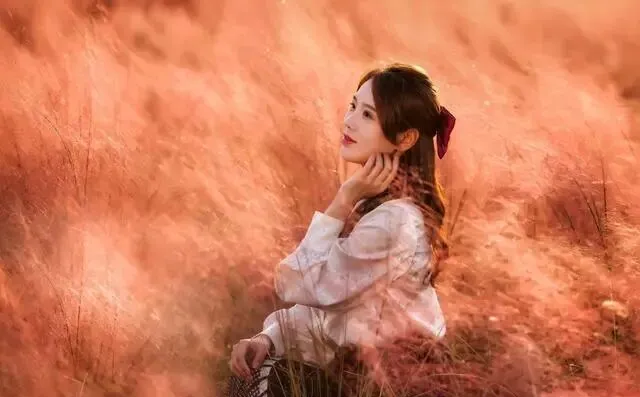 如果不想一直站着,可以试试坐在粉黛草边缘,身体侧坐,双腿自然收一收,不要太僵硬,一只手轻轻放在脸侧或耳边,另一只手搭在腿上,眼神可以看远一点,也可以低头浅笑,这个动作特别适合修饰腰线和脸型,坐姿对普通人也更友好,不容易紧张,拍出来会有一种温柔知性的感觉,安安静静地就很好看,