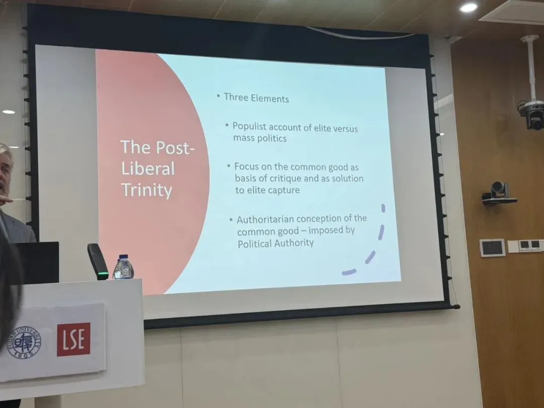 教授的主要观点是批判后自由主义,指出它走向传统保守主义的风险,认为传统保守主义的政治是约束、秩序、权威和稳定。尽管自由主义确实过于天真,但建立一个包容差异的全球秩序,仍然是值得我们追求的目标。