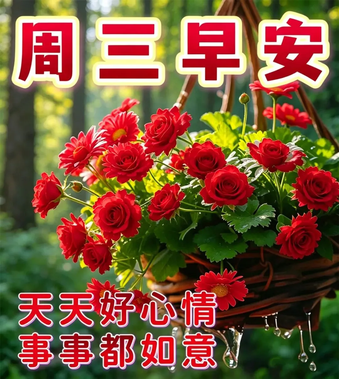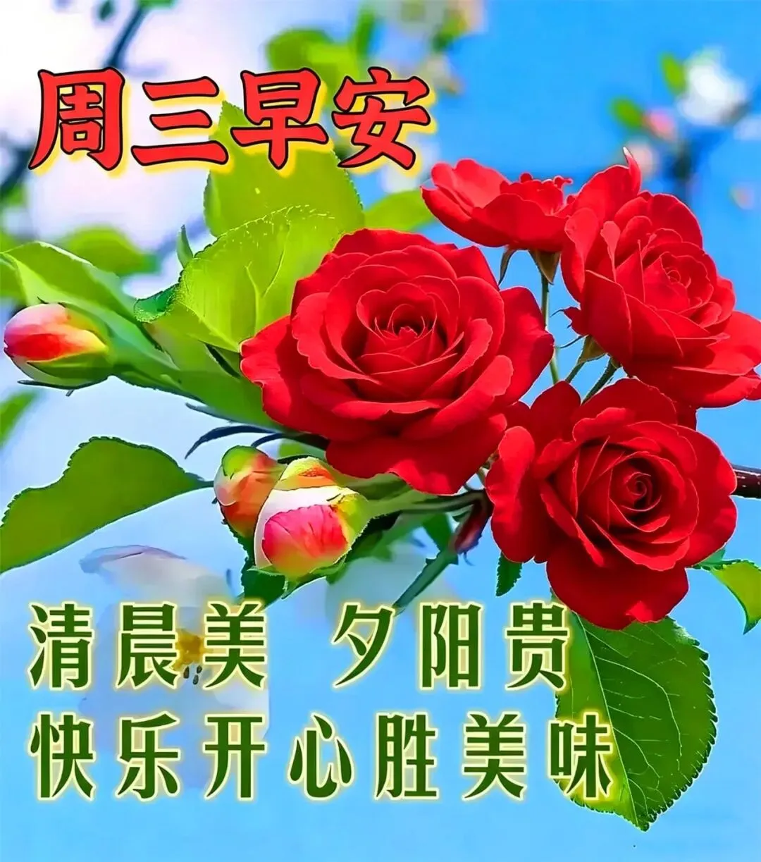 周三了,睁开双眼,看旭日灿烂;舒展笑脸,听鸟儿呢喃;拥抱快乐今天,迎来开心无限。朋友,早安,愿你无忧无烦,好运连连!