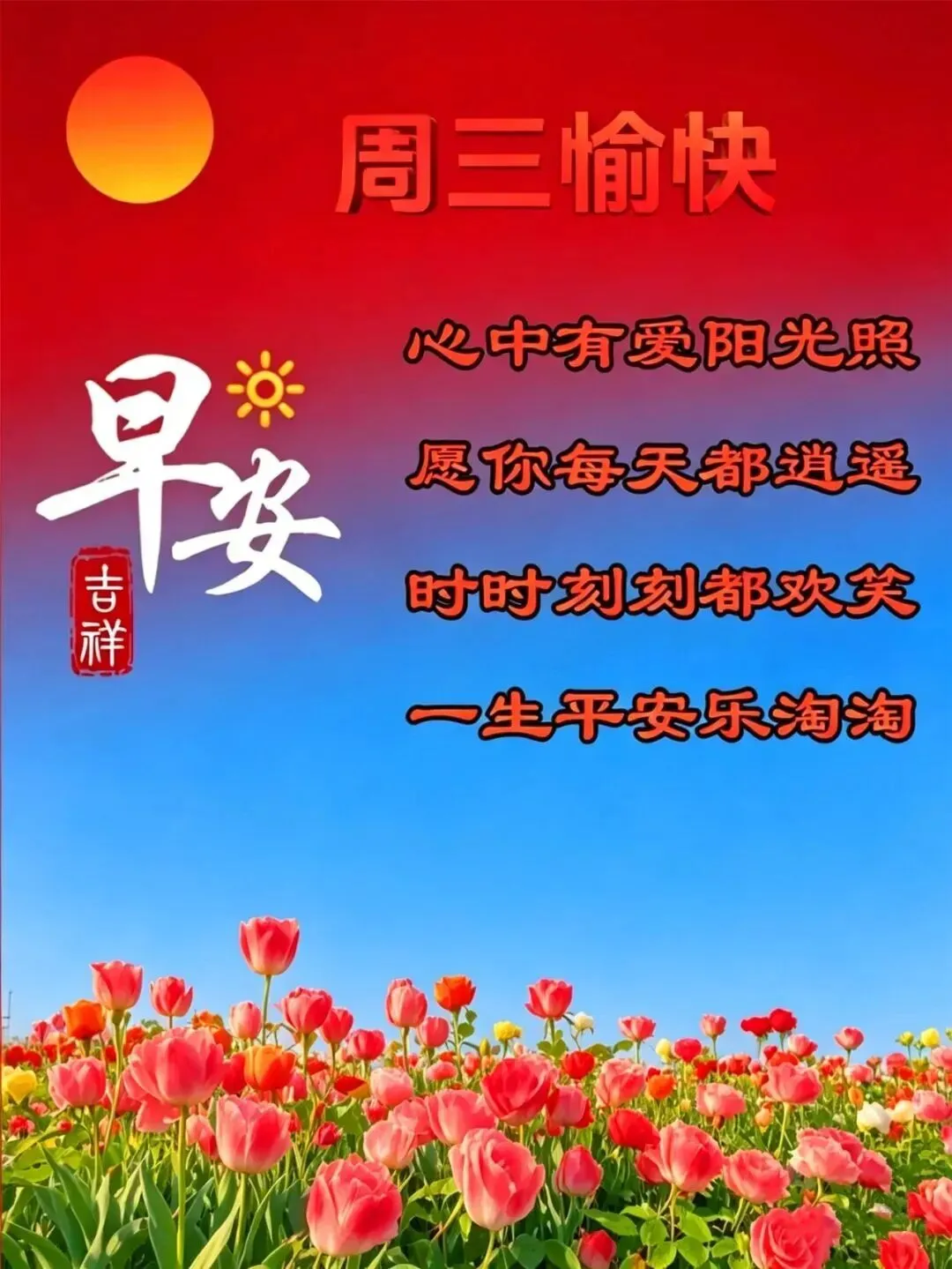 清晨红日映东方,信息一到手机响,暖暖问候送祝福,愿你心情更舒畅,祝你平安又健康,天天快乐又吉祥,周三早上好!