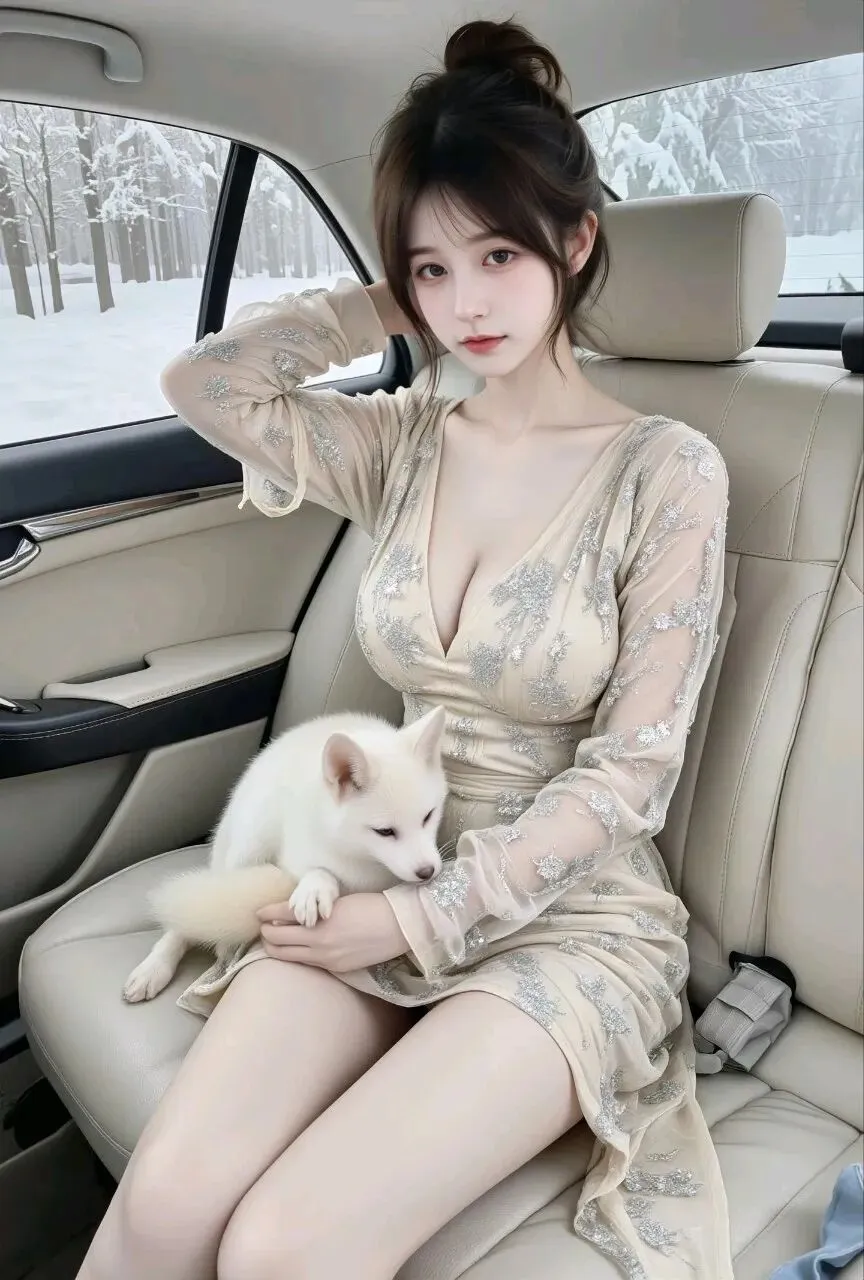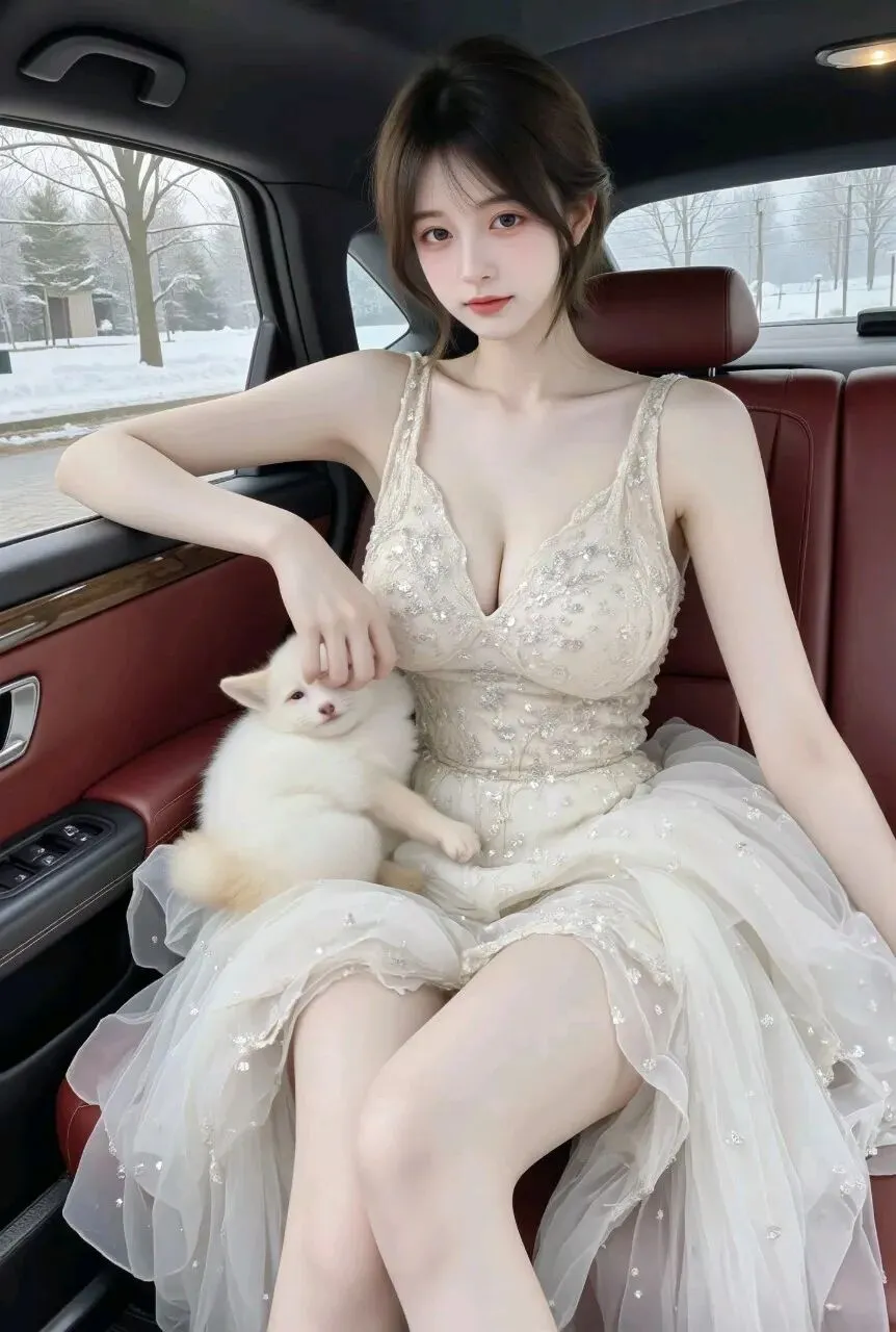 我穿着一袭米白色的亮片纱裙,裙身绣着银线勾勒的花叶,在车厢的暖光下泛着细碎的光泽,像把整片星空穿在了身上。深V的剪裁衬出温柔的线条,薄纱的裙摆垂落,与白狐的雪白绒毛相映成趣,仿佛我本就该是这冬日童话里的主角。抬手挽发时,耳间的碎钻耳坠轻轻晃动,与窗外的雪光交相辉映,每一个瞬间都美得像一幅精心雕琢的油画。