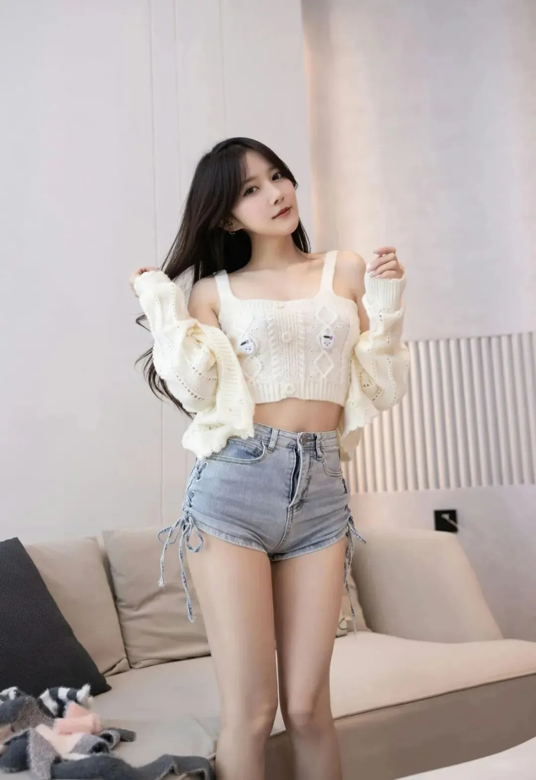 米色吊带毛衫+开衫,搭配牛仔短裤,可爱又性感。