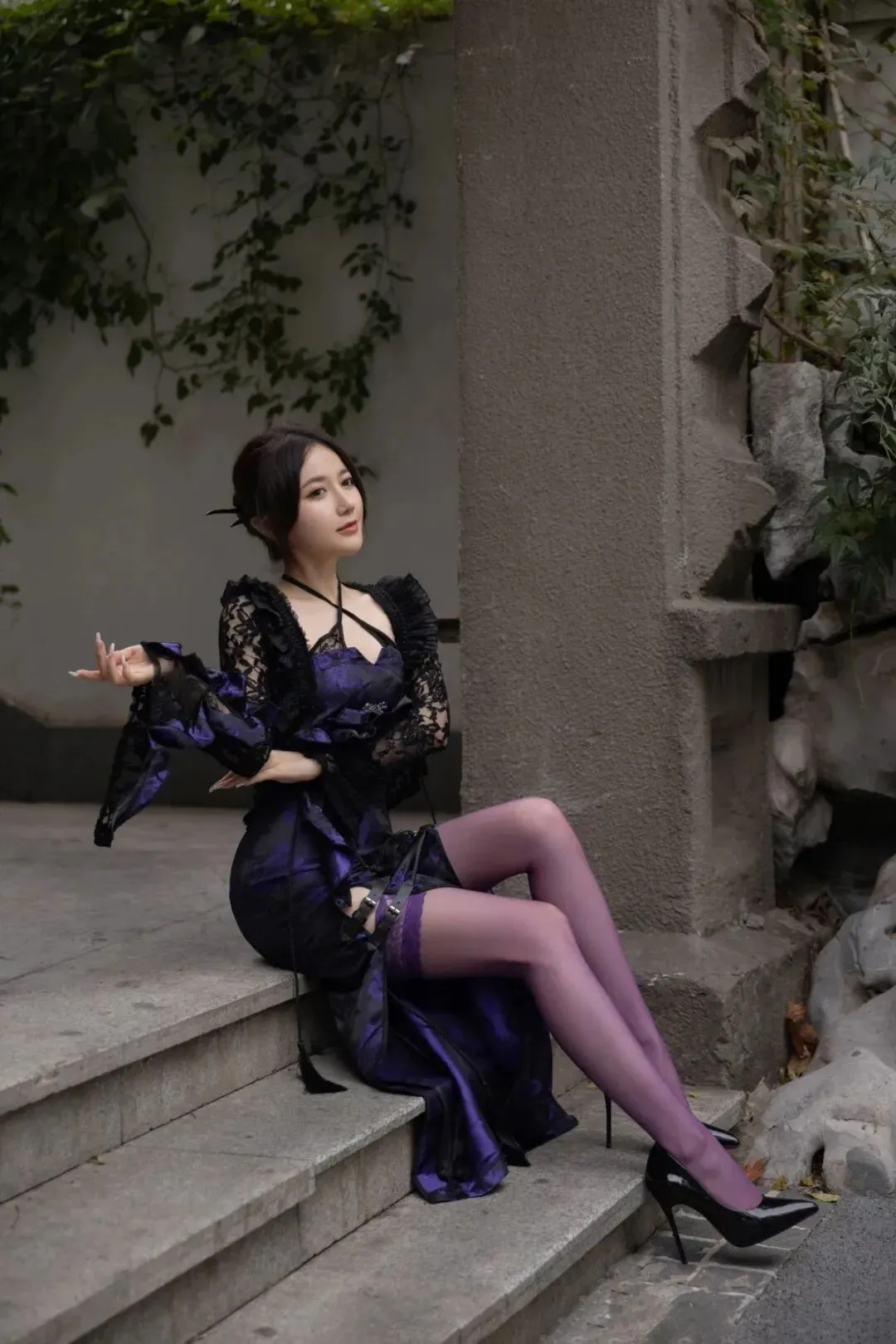 暗紫色露肩连衣裙,搭配性感紫色丝袜,黑色高跟鞋,一举一动都非常撩人。