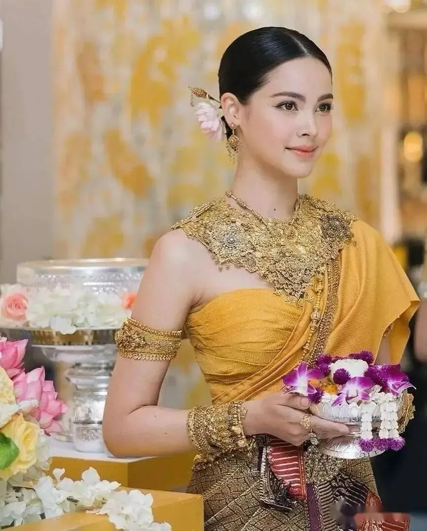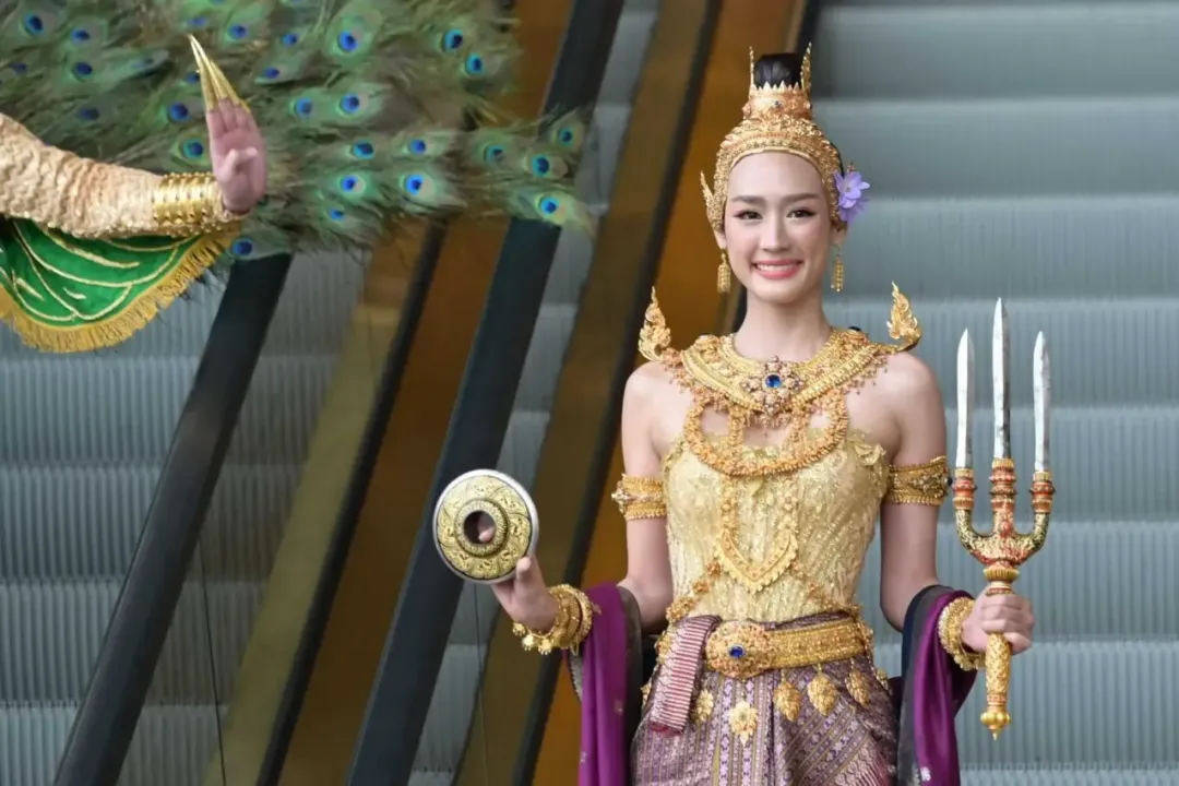 因《天生一对》爆火的 Bella,是泰英混血美女。她的古装扮相十分惊艳,在宋干节的扮相更是让人难忘。2024 年宋干节,她扮演玛哈宋干的女儿玛霍通女神,身着淡紫色泰国华服,手持脉轮和三叉戟,整个人庄严无比,即便在炎热的天气下,也依旧保持着优雅,为民众送去祝福。