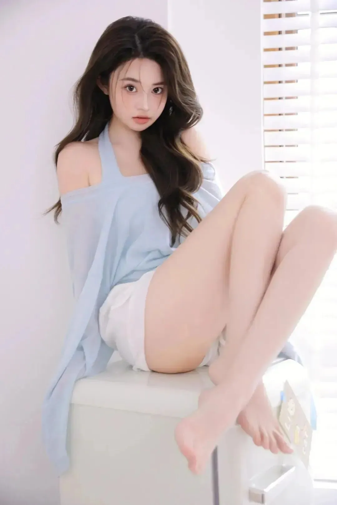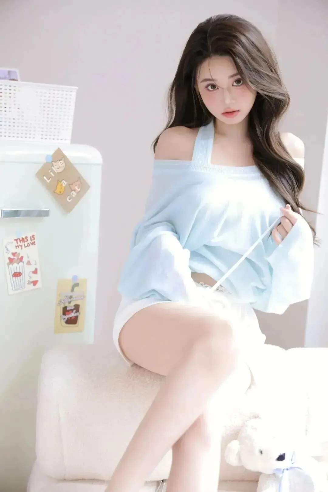 首先说说穿搭逻辑。居家写真最忌讳穿得太正式或者颜色太杂乱。像图里这种浅蓝色搭配白色,简直就是清新界的天花板。蓝色自带一种静谧降温的效果,白色则增加了画面的通透感,两者结合就是视觉上的降温神器。上衣选择这种露肩的设计,微微露出锁骨线条,既不会过于暴露,又能增添几分小性感,视觉上还能显脸小。下半身搭配简单的白色短裤,最大程度地露出腿部线条,这是显腿长的关键小心机。面料最好选择柔软亲肤的针织或棉质,这样在镜头前呈现的质感才会温柔无害,让人看起来毫无攻击性。