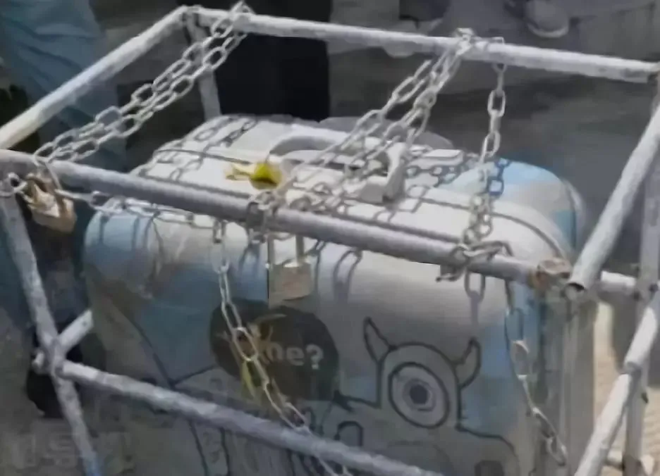 行李箱被铁架焊着,外层缠着密密麻麻的铁链子,两端还挂着两把大锁。