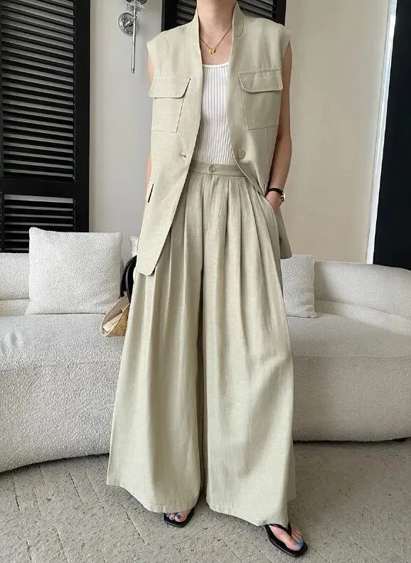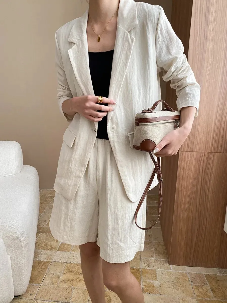 内搭一件白色真丝吊带,下装搭配同色系亚麻阔腿裤,顺色搭配视觉上拉长身形,小个子也能穿出大长腿。脚踩一双尖头浅口单鞋,搭配简约的珍珠项链,既有职场的专业干练,又不失女性的柔美优雅,清爽利落,在办公室里也能时刻保持精致,轻松成为职场气质女神。