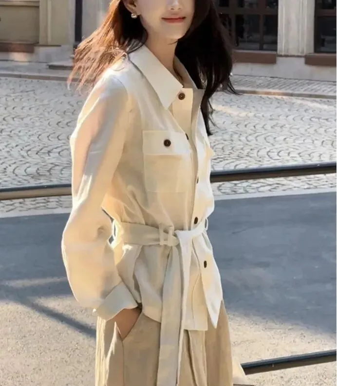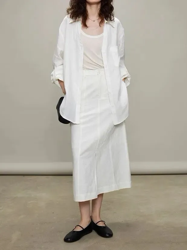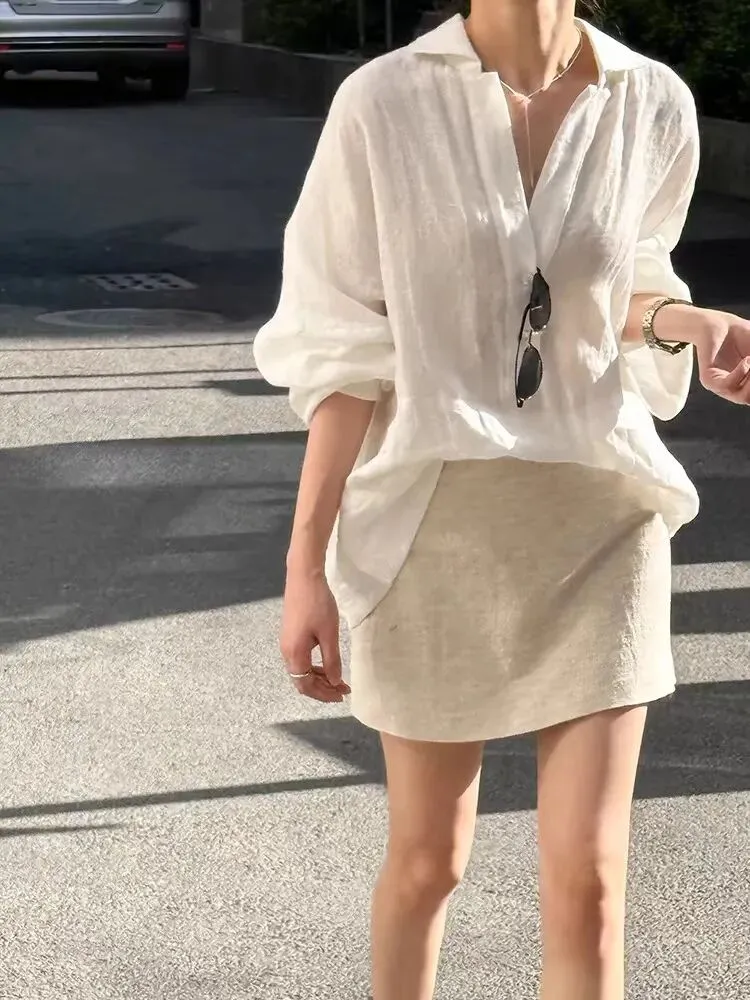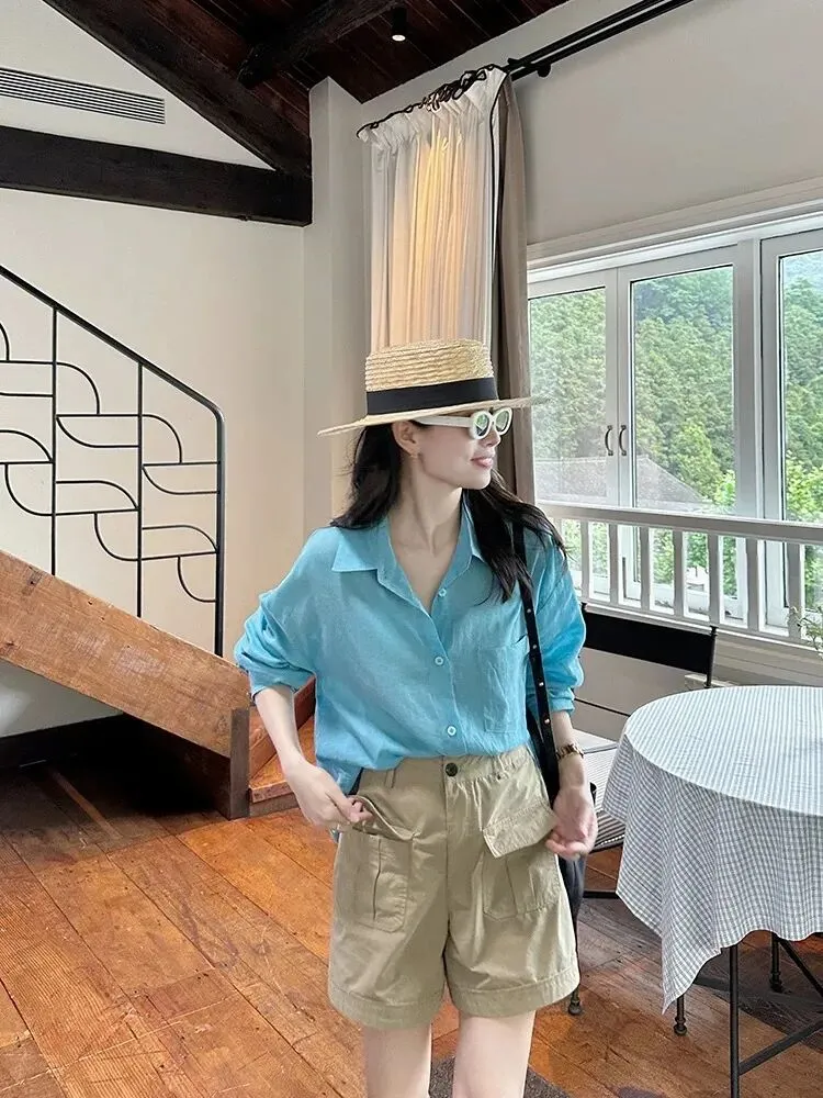 偏爱文艺感的女生,一定要试试亚麻与浅色系的搭配。淡蓝色亚麻上衣搭配米白色亚麻半裙,同材质叠穿,质感统一又高级,清新的配色像春日里的蓝天与白云,温柔又治愈。