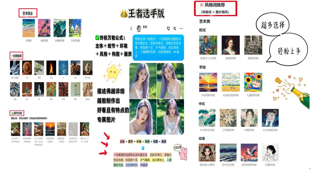先记住一个万能公式:主题+细节+环境+风格+构图+画质