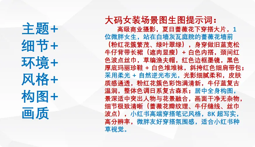 以“大码女装”为例,如果你要做一篇微胖女孩穿搭笔记,可以试试下面这段提示词(根据上面的提示词框架,可以改成自己想要的):