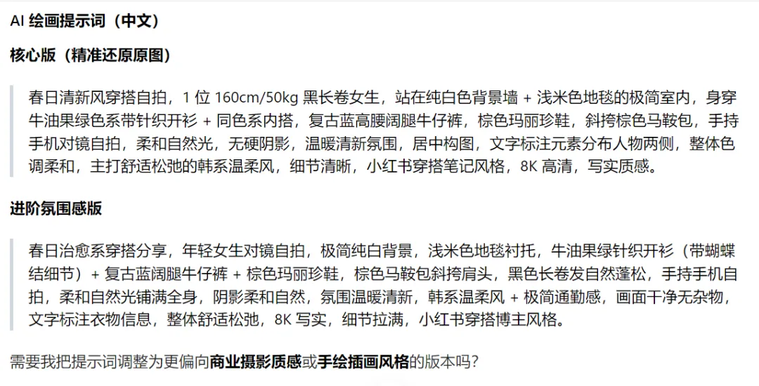 如果你不能实拍,可以用AI生成穿搭场景图,然后和商品截图拼在一起。这样既有种草感,又有购买指引,转化率反而比单一图片更高。