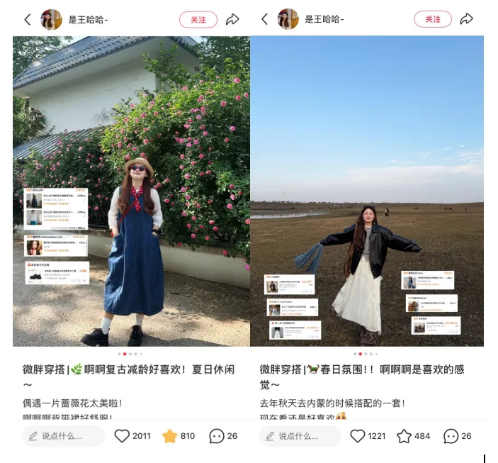 将店铺购买截图和穿搭场景图进行拼贴,此类图文数据都不错(@是王哈哈~)。