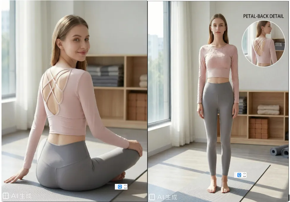 测试了一下,输入“室内瑜伽场景,24岁年轻女孩,穿参考图同款瑜伽服,背影侧头,光线明亮”,生成的图片质感相当不错,完全可以作为电商主图使用。
