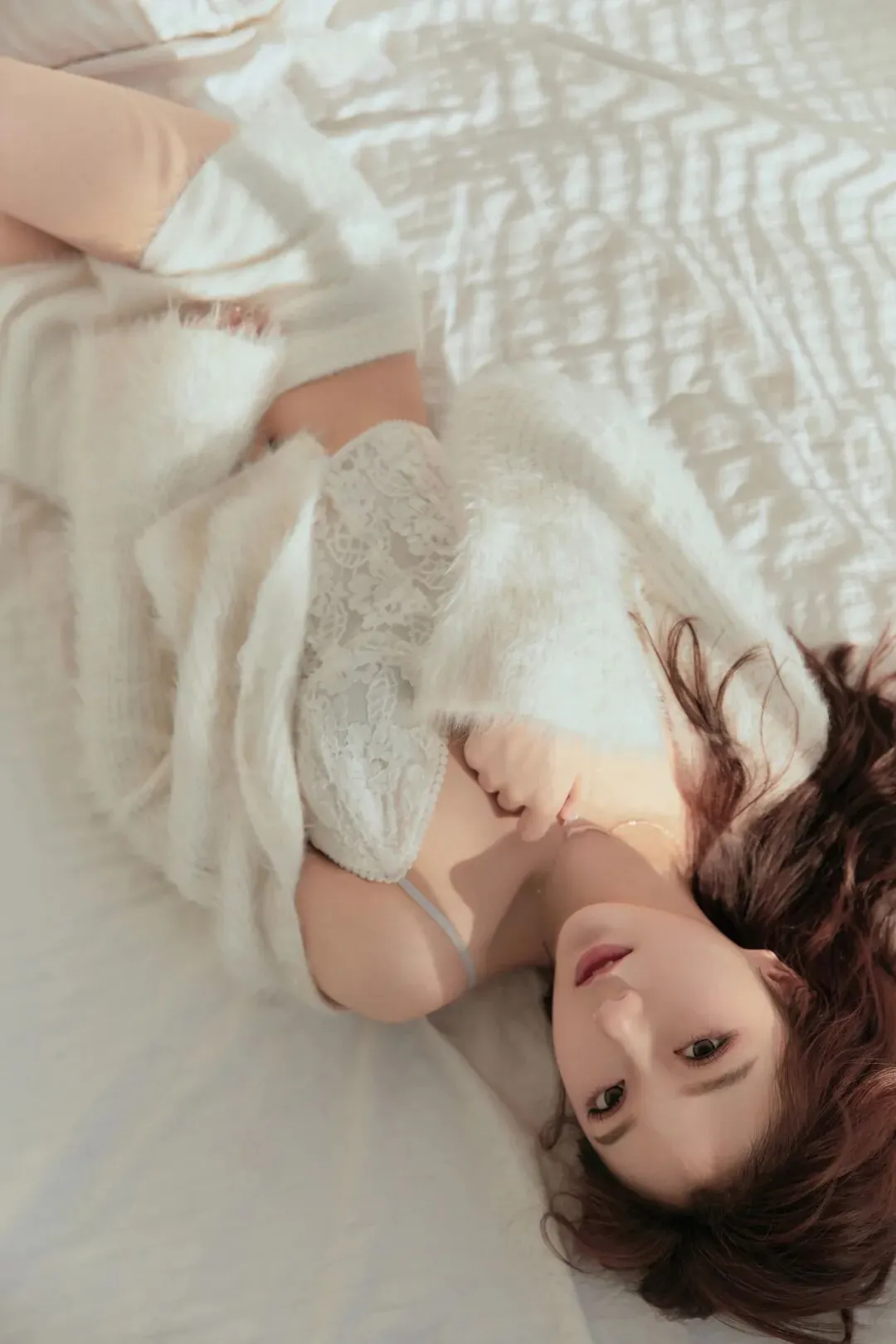 毛绒材质的衣物、蓬松卷发、光影在床品上的自然纹理,都在细节上强化了 “软、暖、柔” 的氛围,让照片更有故事感和情绪张力。