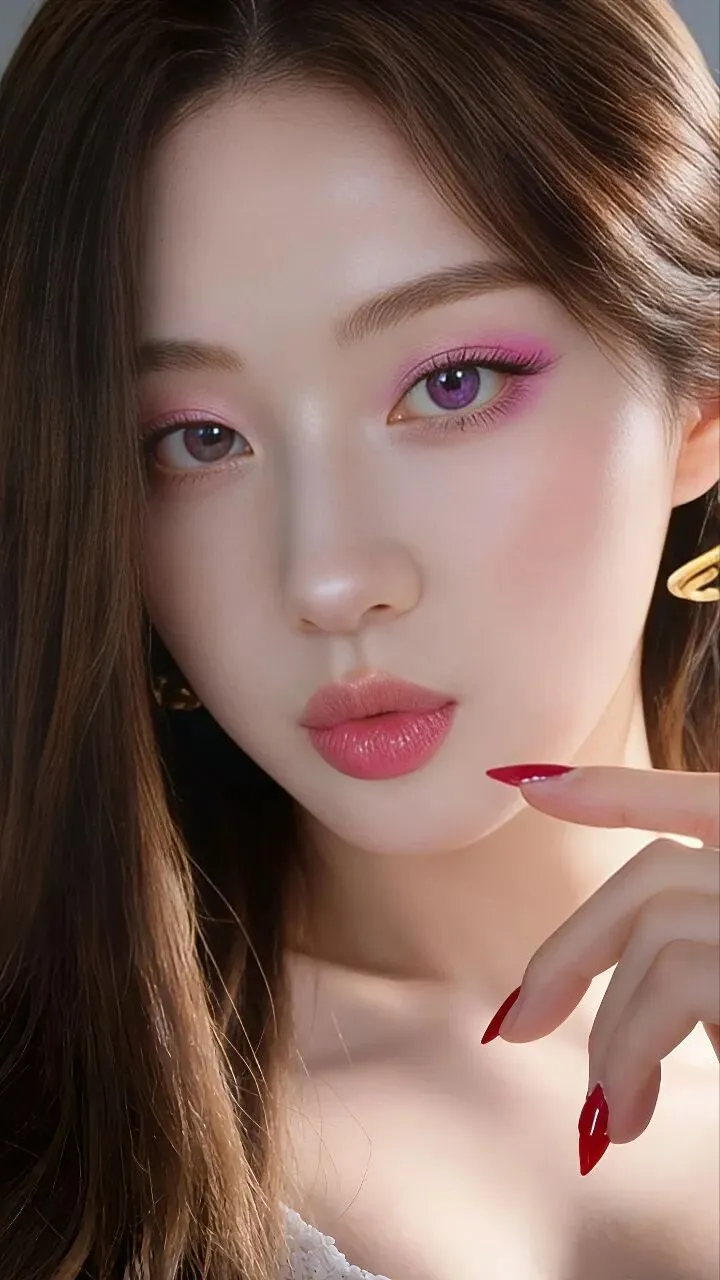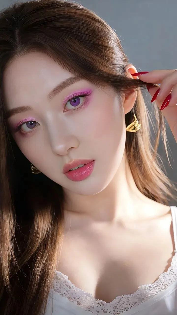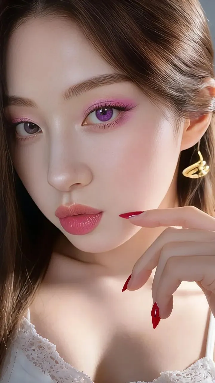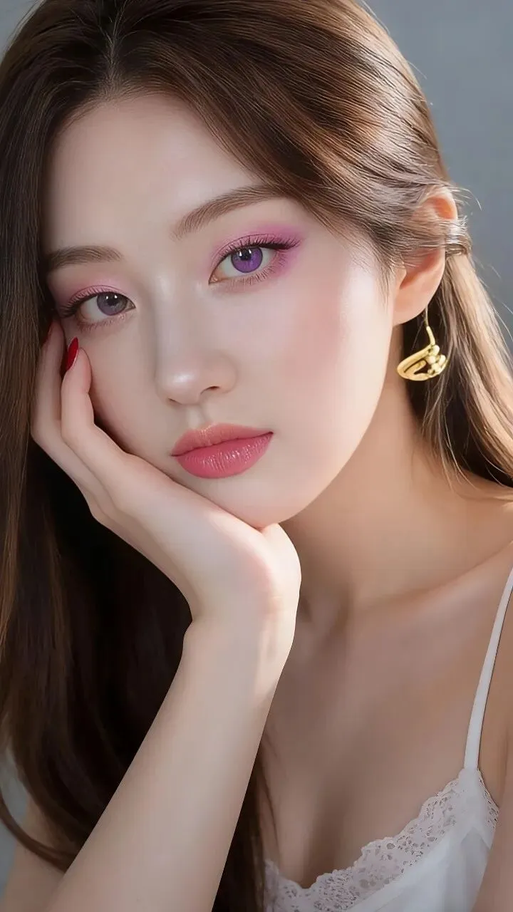 - 眼妆:低饱和樱花粉铺色,眼尾晕染出渐变雾感,搭配紫调美瞳,瞬间放大双眼,像把春日樱花揉进了眼睛里,温柔又灵动