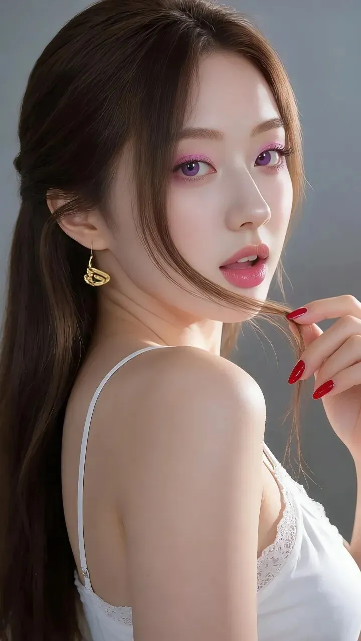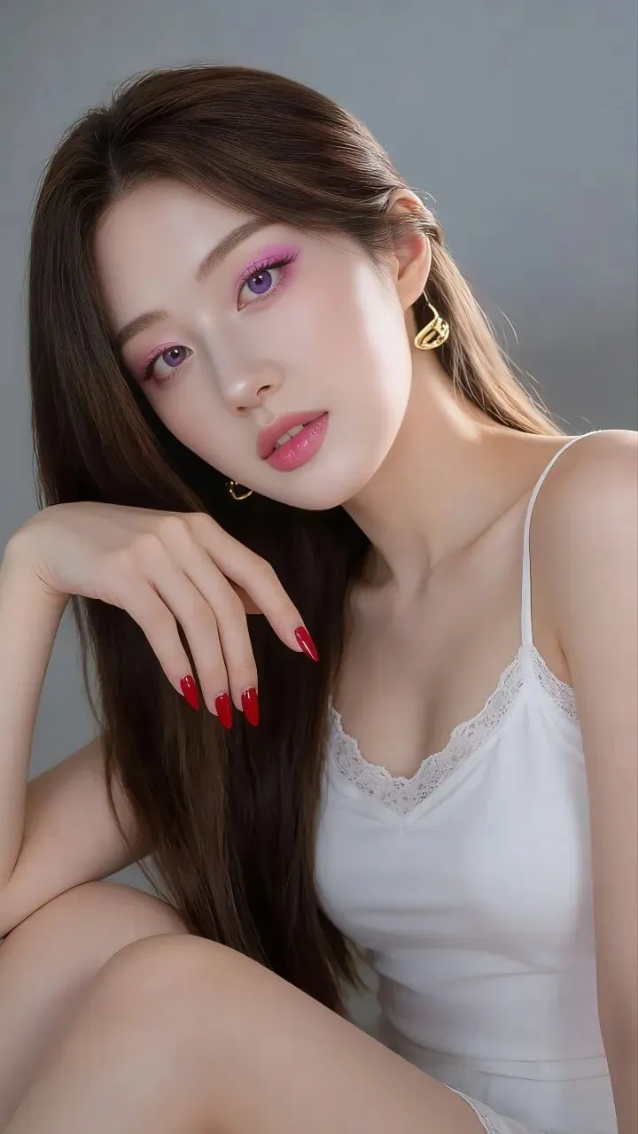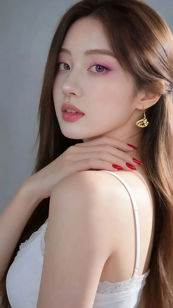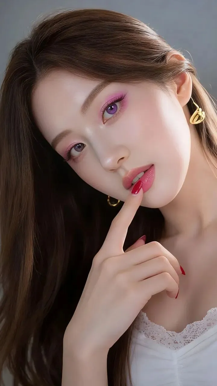 - 眼妆:低饱和樱花粉铺色,眼尾晕染出渐变雾感,搭配紫调美瞳,瞬间放大双眼,像把春日樱花揉进了眼睛里,温柔又灵动
