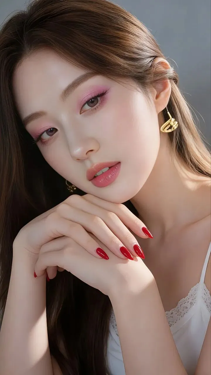 - 细节加分:酒红色尖形美甲+复古金耳环,精致感拉满,每一处都在说「我很会美」