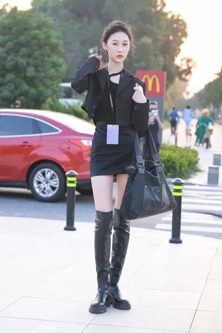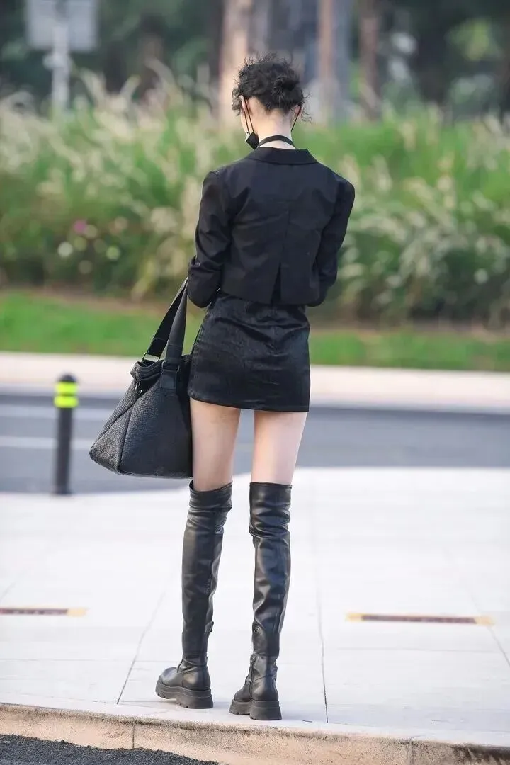 如果说上面一套是温柔小辣椒,那么接下来这套就是职场女王的范儿了。短款黑色西装配过膝靴又A又飒。博主所穿的西装比常装要短一些,正好处在腰线位置处,搭配了一件黑色吊带上衣,显出腰腹细窄部分的曲线。