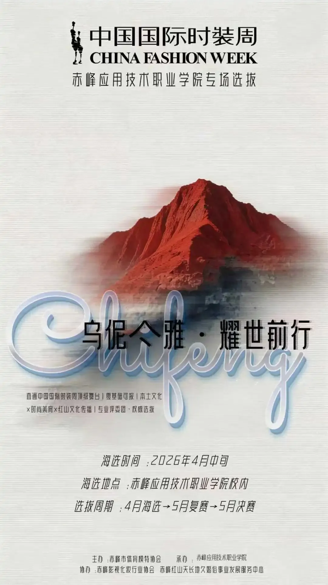 为助力本土品牌登上中国国际时装周舞台,传承推广赤峰红山文化,搭建校园美育实践平台,由赤峰市体育模特协会主办,赤峰应用技术职业学院承办,赤峰影视化妆行业协会、赤峰红山天长地久婚俗事业发展服务中心协办的“乌伲吉雅·耀世前行”直通中国国际时装周赤峰模特选拔大赛,正式开启我校专场招募!