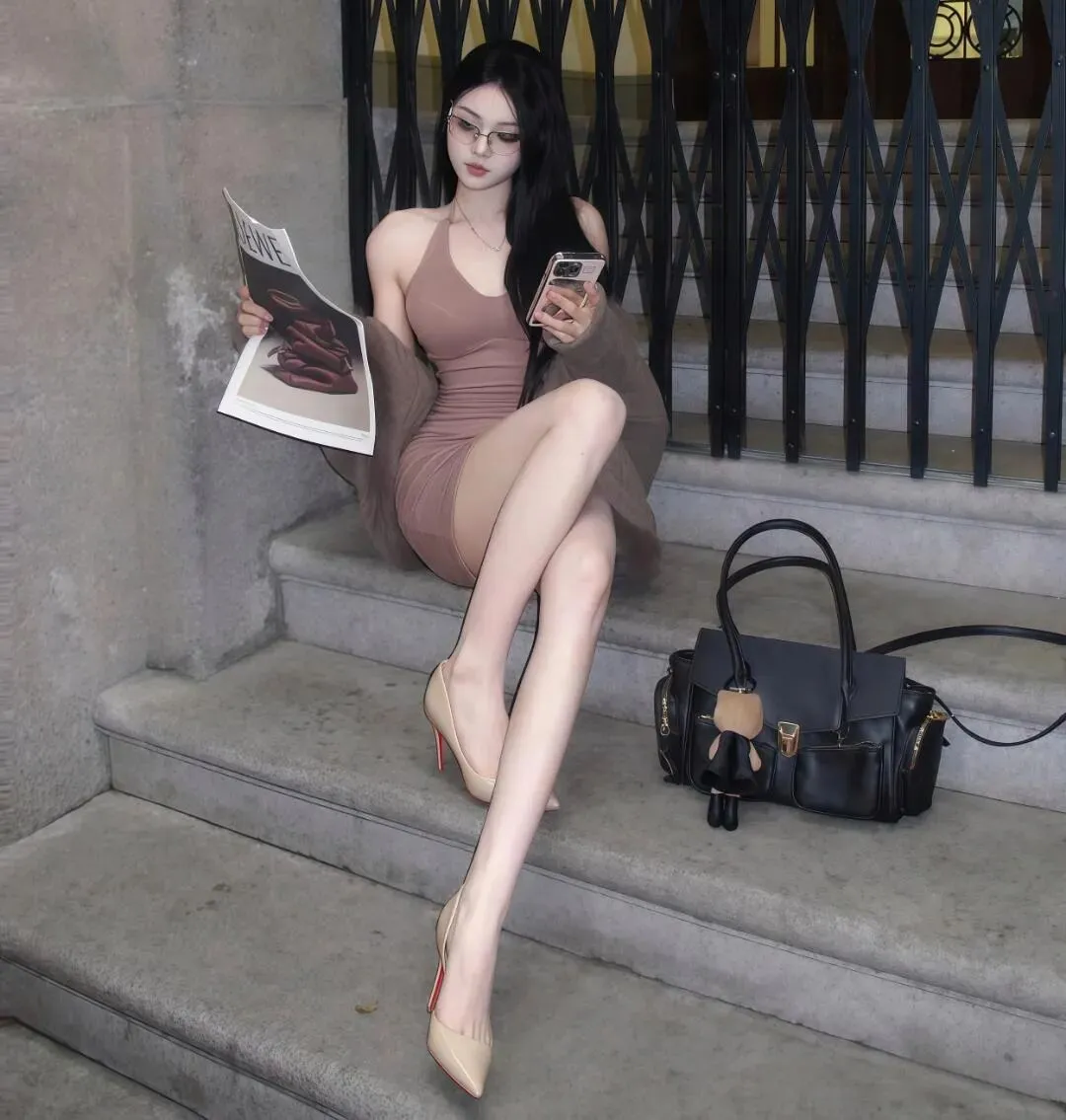好处:交叉腿优化腿型、显腿直,杂志道具丰富画面,前倾姿势收腰显细,适合拍“知性辣妹”“名媛风”,自然不尴尬。