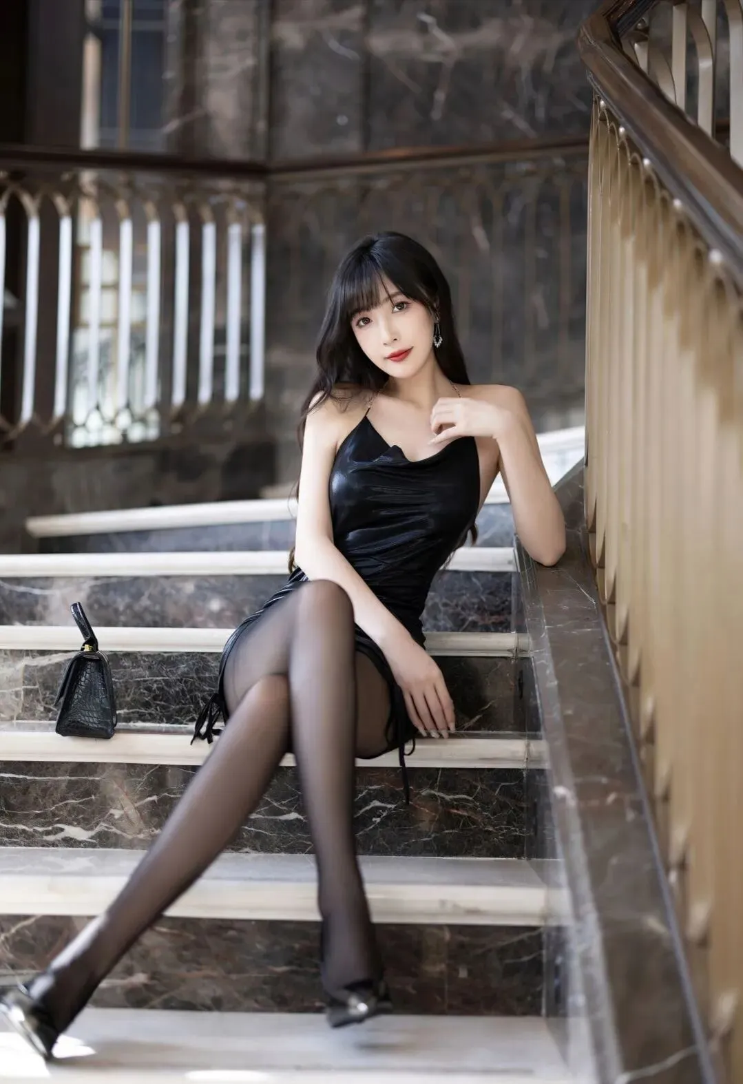 场景与穿搭的适配度,更是让这组写真的高级感再上一层楼。林星阑穿梭于精致的室内空间,金属雕花栏杆与大理石纹理的台阶自带奢华质感,暖调光影洒在身上,与黑色穿搭形成柔和对比。她或侧身倚栏,单腿微曲展现曼妙身姿;或轻坐台阶,慵懒倚靠尽显松弛感;亦或蹲姿俯身,抬手轻触裙摆,每一个姿态都自然舒展,将黑色吊带裙的魅力发挥到极致。