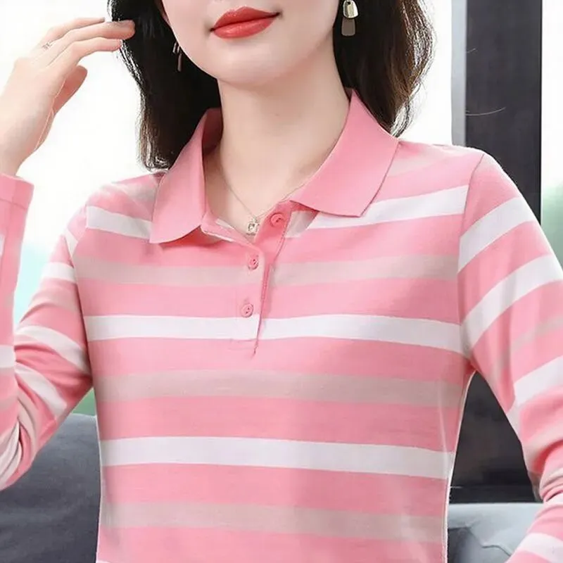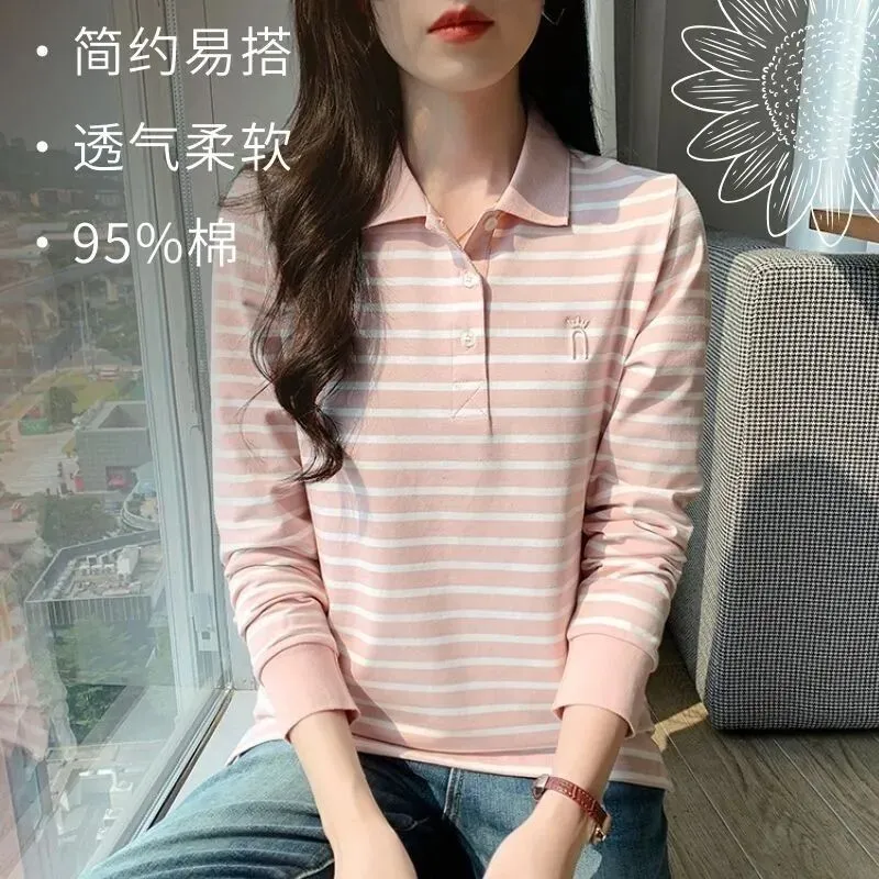 纯棉秋季时尚气质POLO翻领条纹显瘦上衣新款洋气减龄百搭薄款长袖