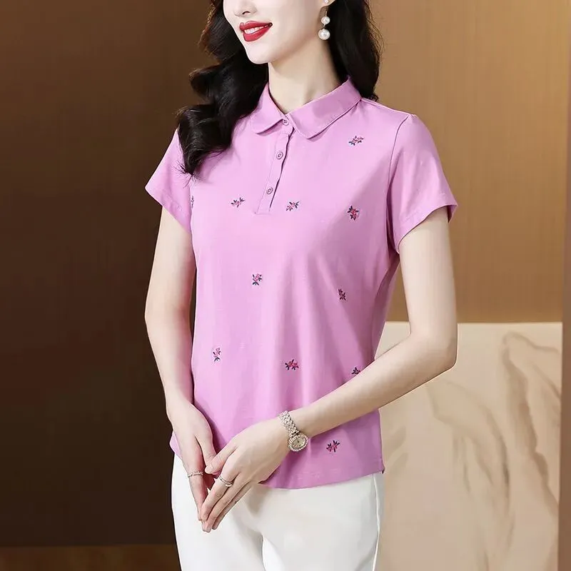 纯棉短袖t恤女宽松2024夏装新款翻领polo衫中老年妈妈减龄上衣服
