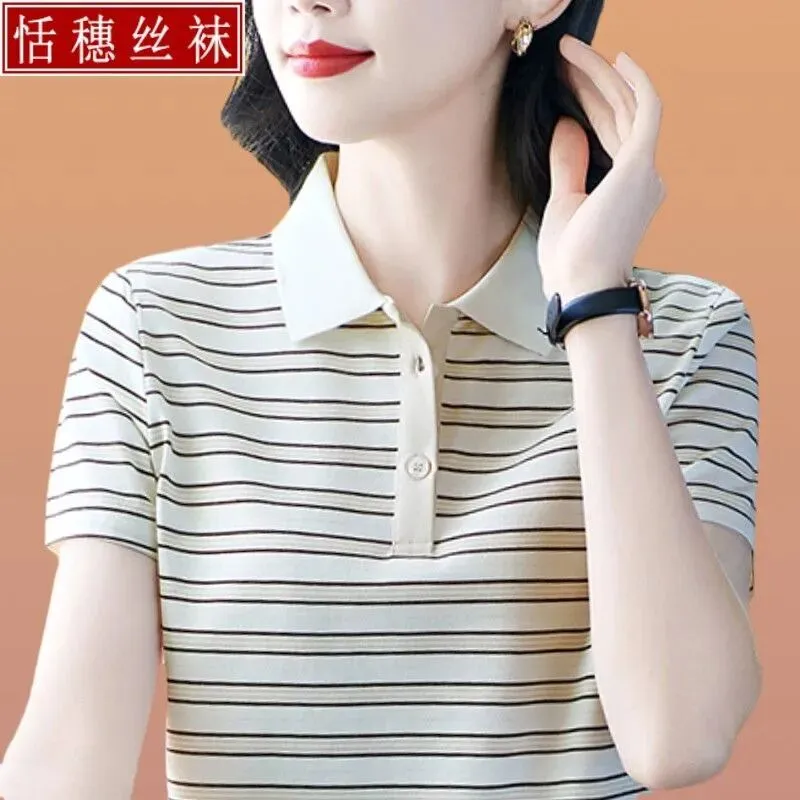 洋气中年妈妈装短袖t恤夏季新款时尚翻领条纹polo衫修身减龄上衣