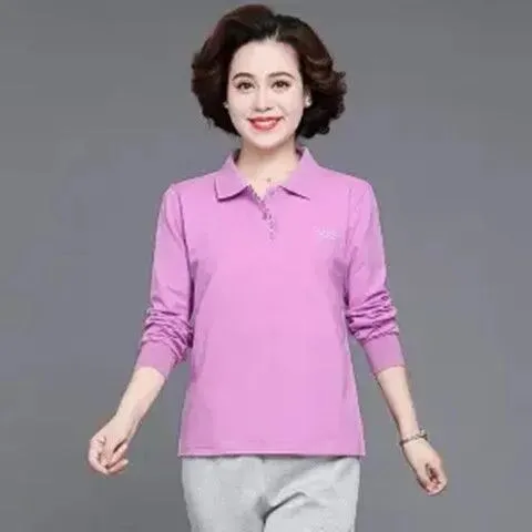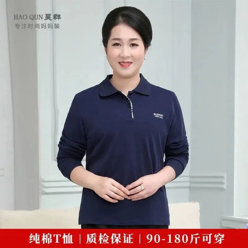 新款翻领纯棉宽松polo衫有领上衣妈妈春秋t恤中老年女士纯色长袖