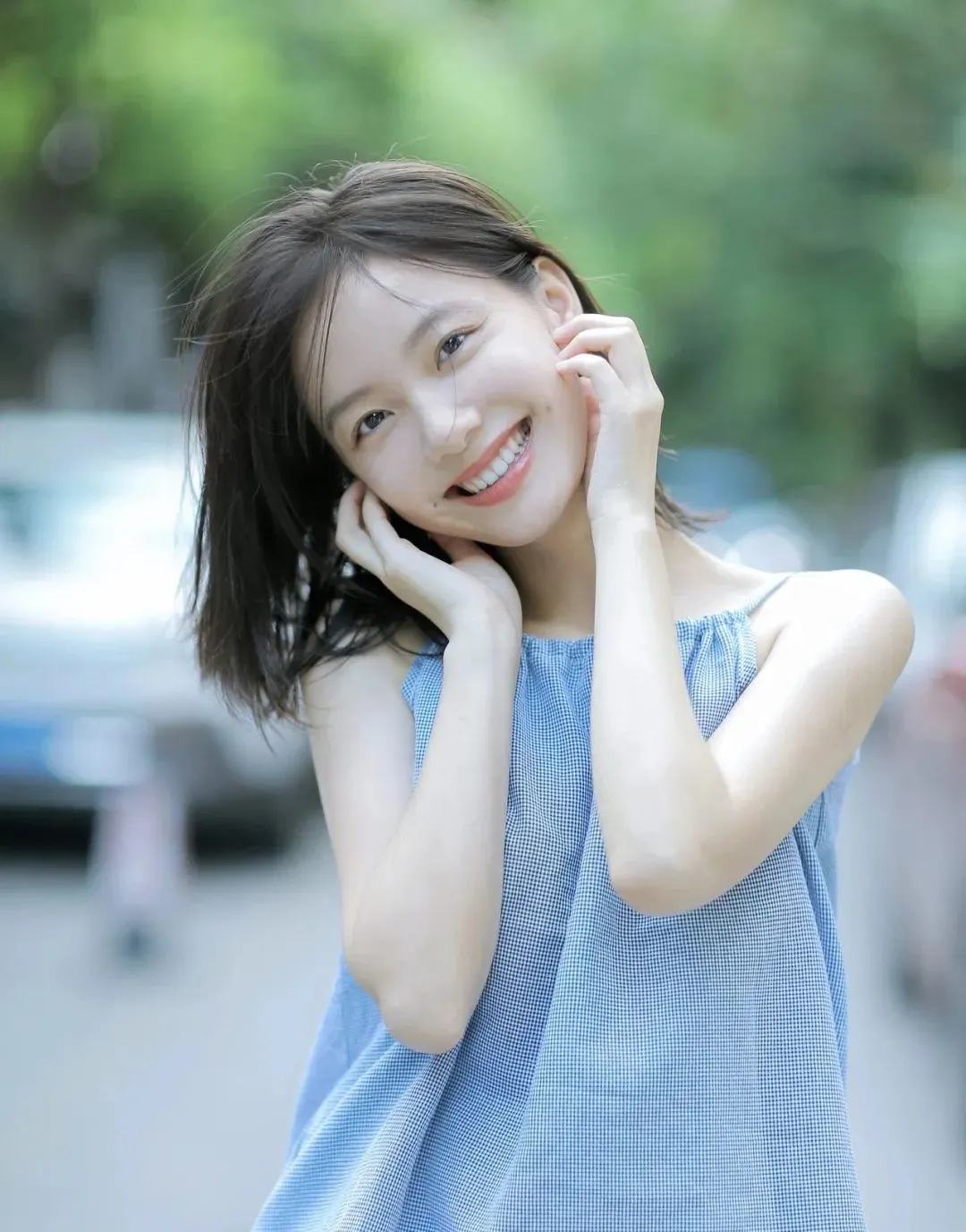 站着拍的时候,双手一上一下轻轻放在脸侧,像整理头发一样自然就好,头微微歪一点,眼神直接看向镜头。这个动作很适合近景,能把脸部线条衬得更柔和,也会显得五官更集中、更耐看。尤其是肩颈露出来的时候,会让整个人看上去特别轻盈,有种自然又甜美的少女感。