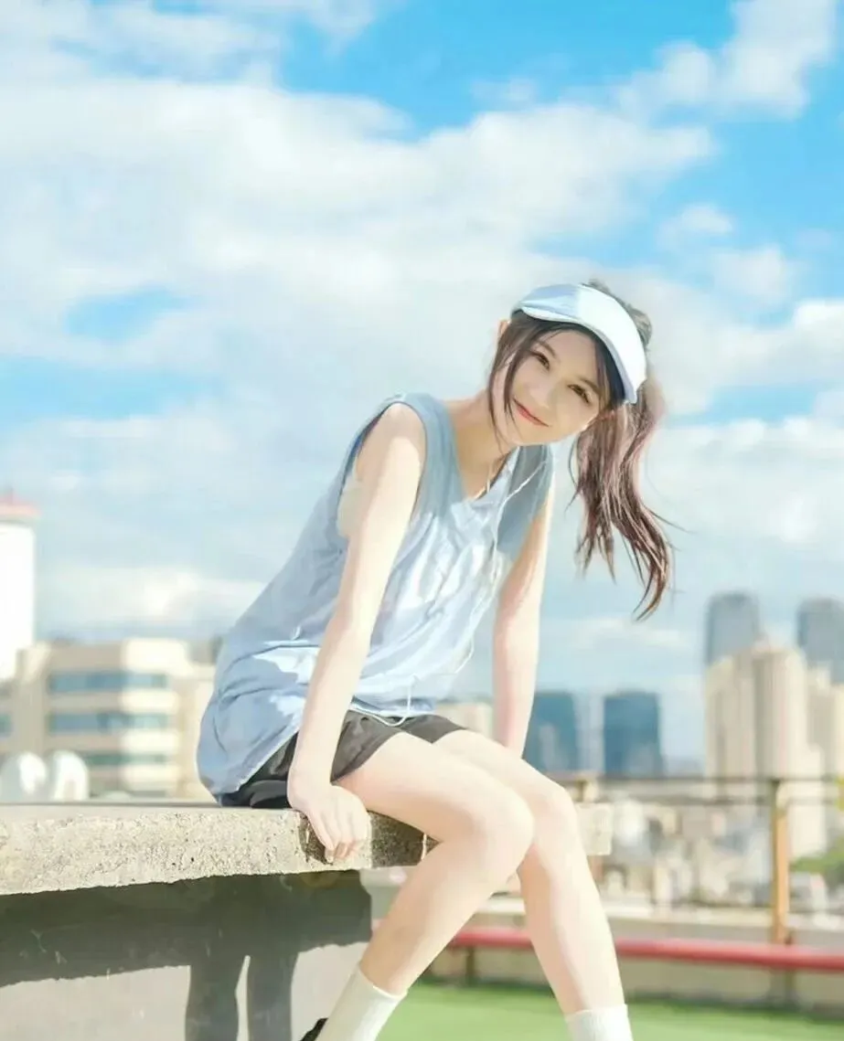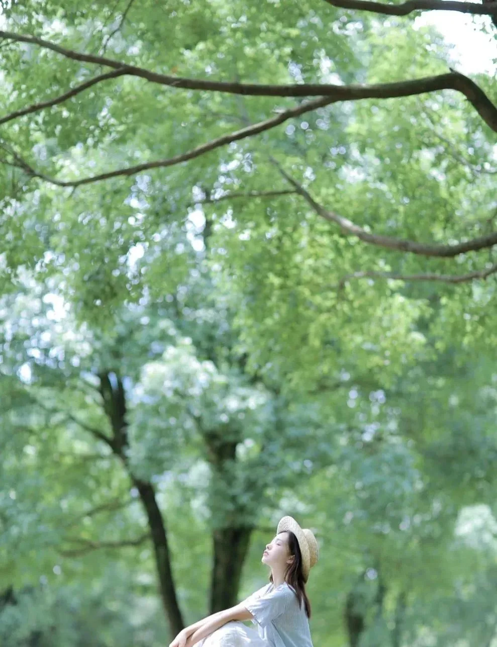如果是在公园、草地或者树下拍照,可以直接坐下来,双腿自然收起,手轻轻环住膝盖,头微微仰起,像是在感受风或者晒太阳。这个姿势虽然简单,但特别能拍出一种安静的松弛感,脸部侧线会更流畅,整个人也会显得很乖很干净。尤其是大面积绿色背景里,这种动作会让照片特别耐看,很有夏日电影感