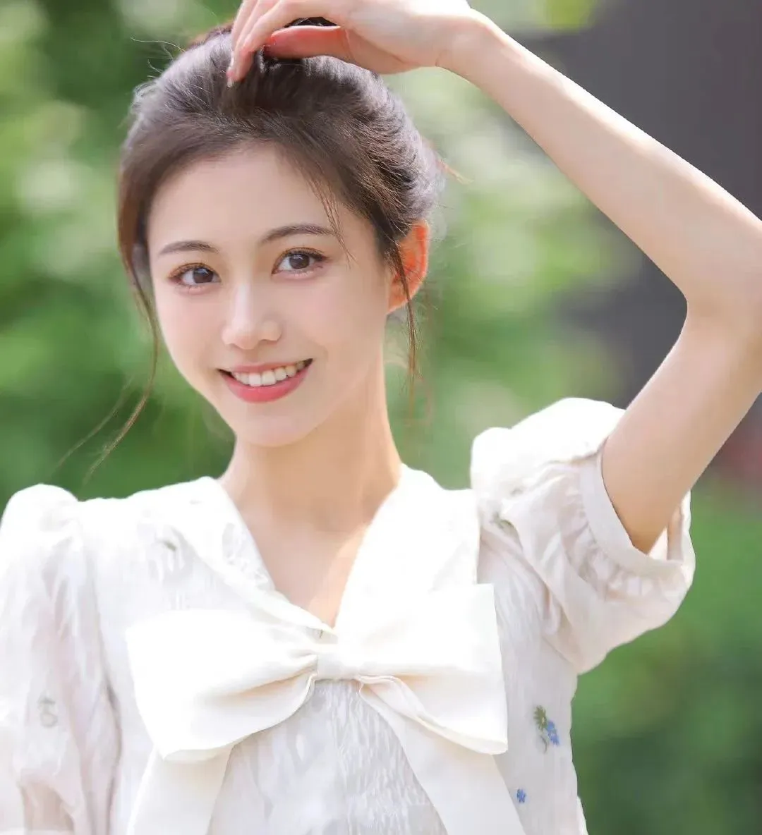 如果你不知道手该怎么放,最简单的方式就是抬起一只手去碰头发,像整理刘海、绑头发那样,另一只手自然垂下或者轻轻放腰侧。这个动作的好处是非常不刻意,能让肩膀打开,脸也更显小,脖子线条会显得更修长。拍出来既有少女的灵动感,又有一种大方温柔的气质,特别适合白裙、泡泡袖这类穿搭。