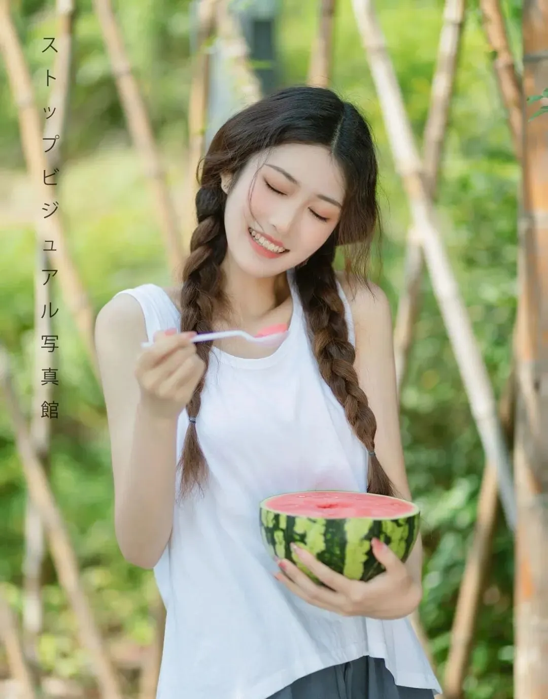 有道具的时候一定别浪费,像西瓜、小勺、饮料这种都很适合夏天。可以一只手抱着水果或者道具,另一只手轻轻抬起,低头看向手里的动作,眼睛不用看镜头。这样拍会让表情更放松,脸部不会紧绷,还会显得整个人特别温柔、很有夏日故事感。尤其是半身角度,特别容易拍出甜而不腻的氛围。