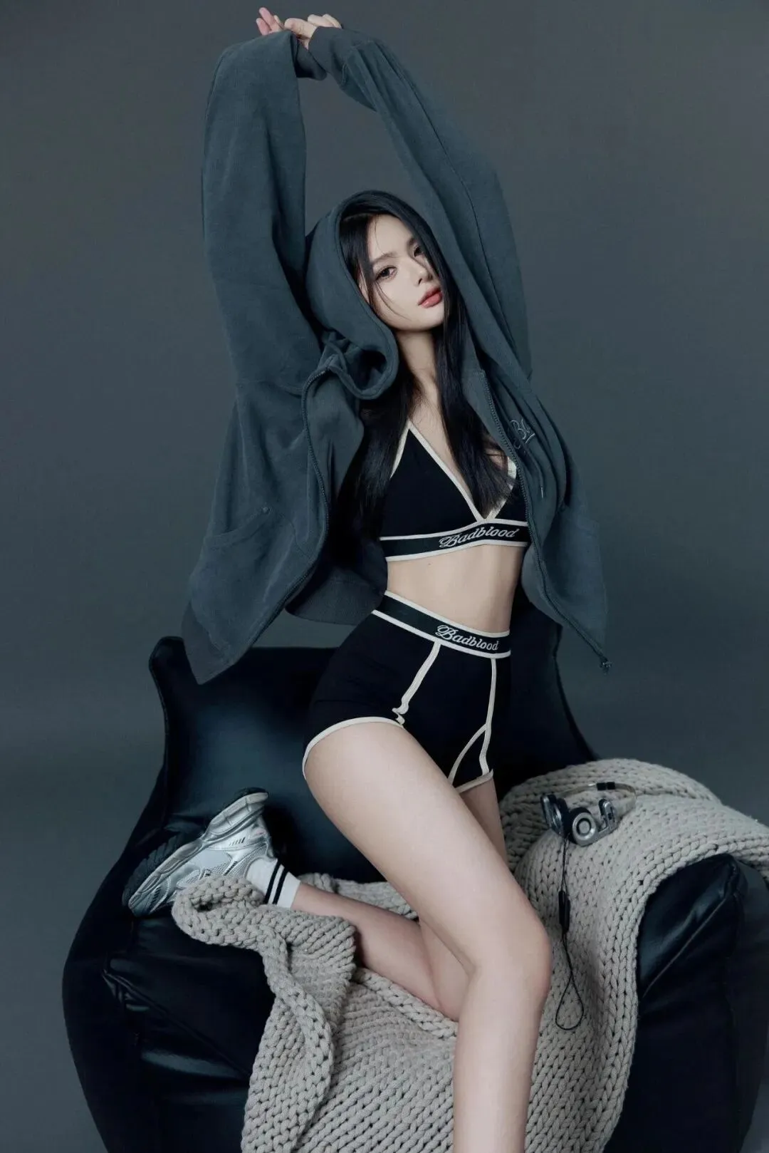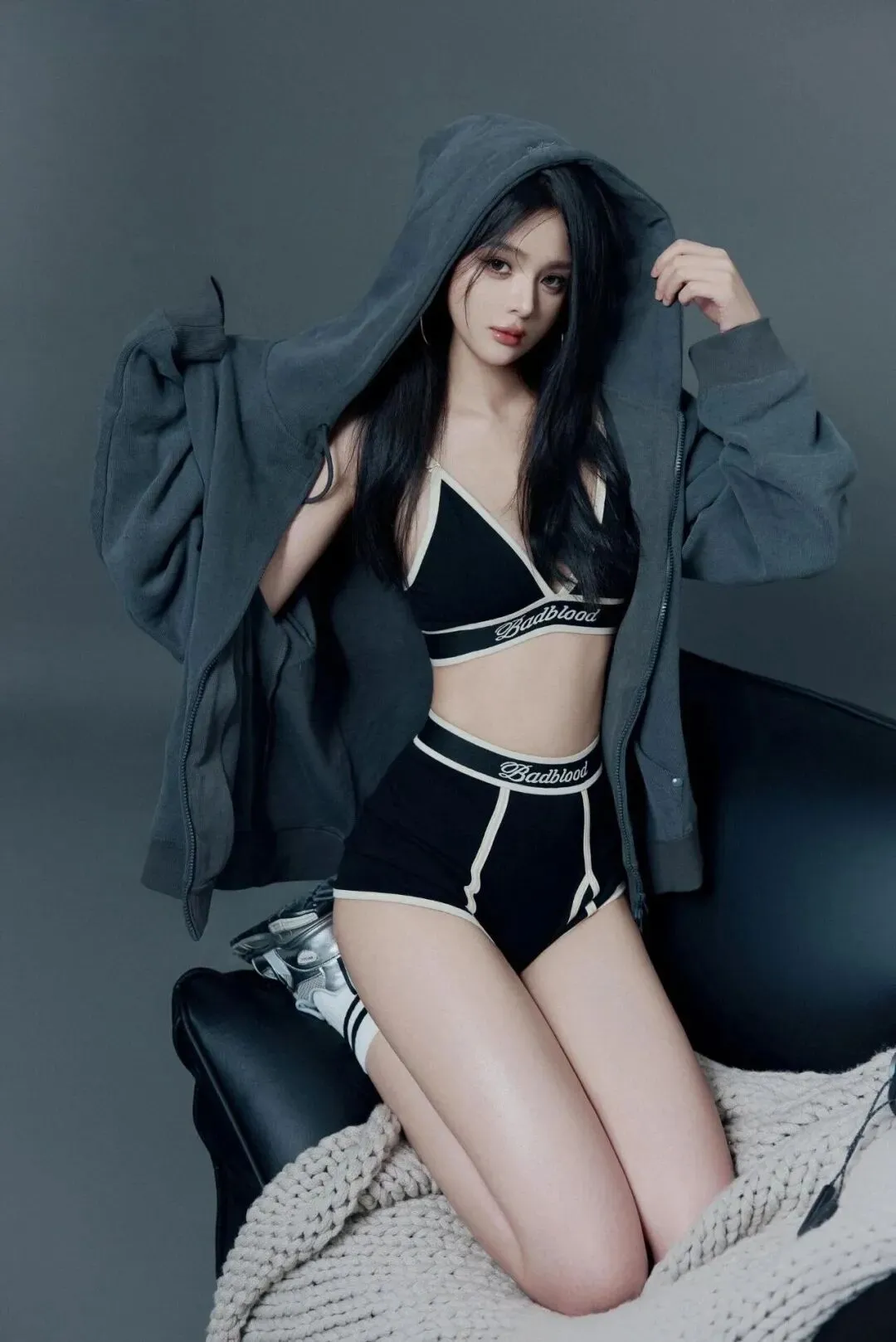 单膝跪在黑色沙发上,身体微微前倾,双手高高举起抓着帽绳,眼睛直视镜头,灰色连帽外套和内搭的运动风穿搭超有范儿,是不是很简单?