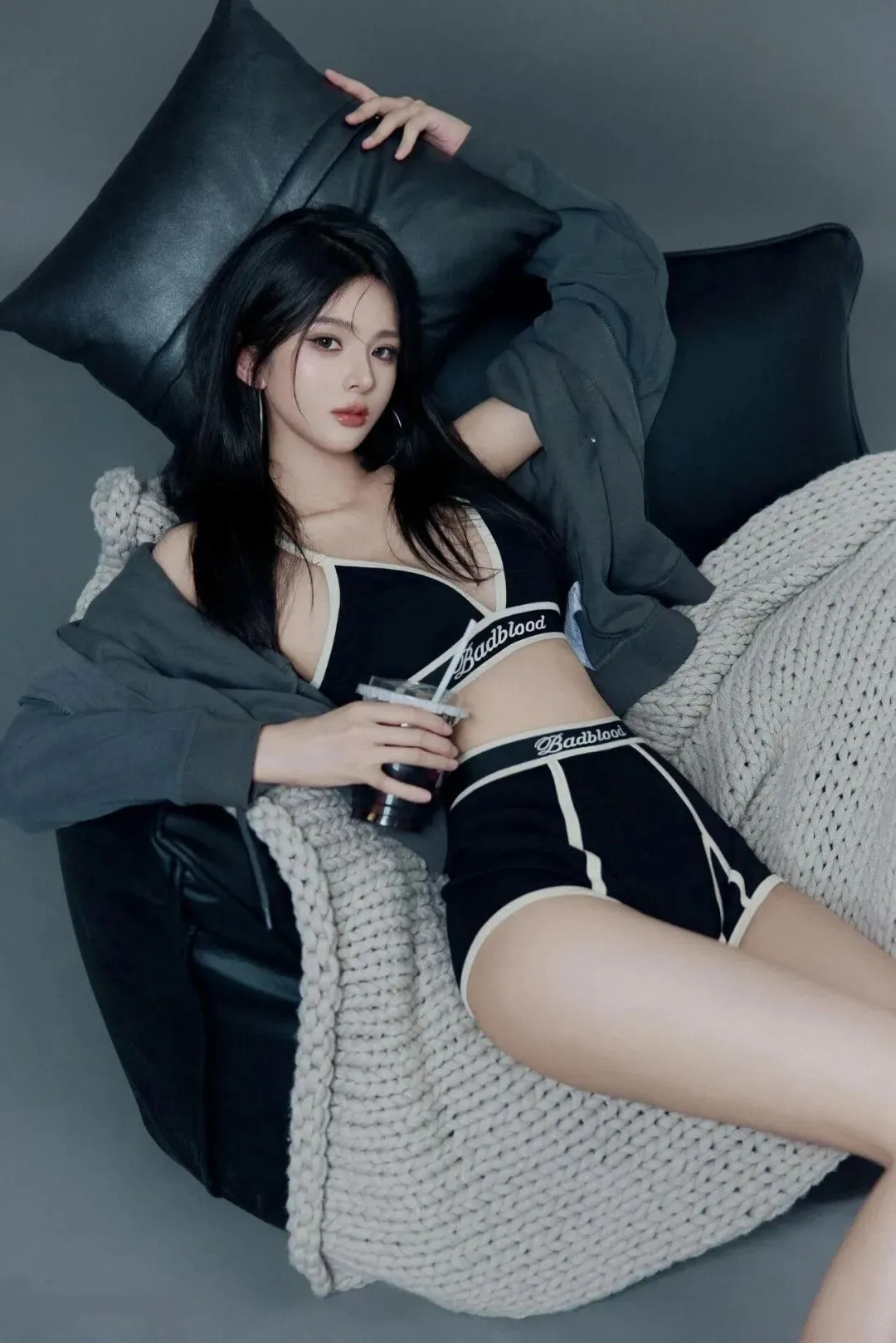 躺在黑色沙发的针织毯子上,一只手拿着饮品,另一只手撑在身侧,双腿自然伸直,眼睛直视镜头,银色运动鞋和穿搭超搭,很有松弛感。