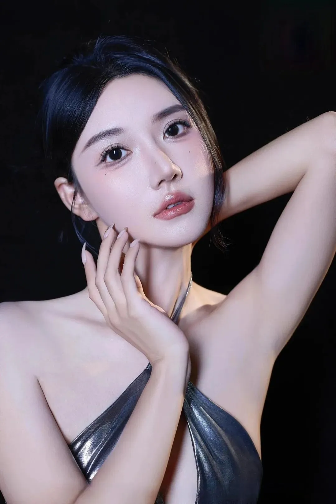 近距离拍摄,一只手轻轻撑着脸颊,另一只手搭在脖子旁,眼睛直视镜头,皮肤的光泽感和裙子的质感对比,特别精致。