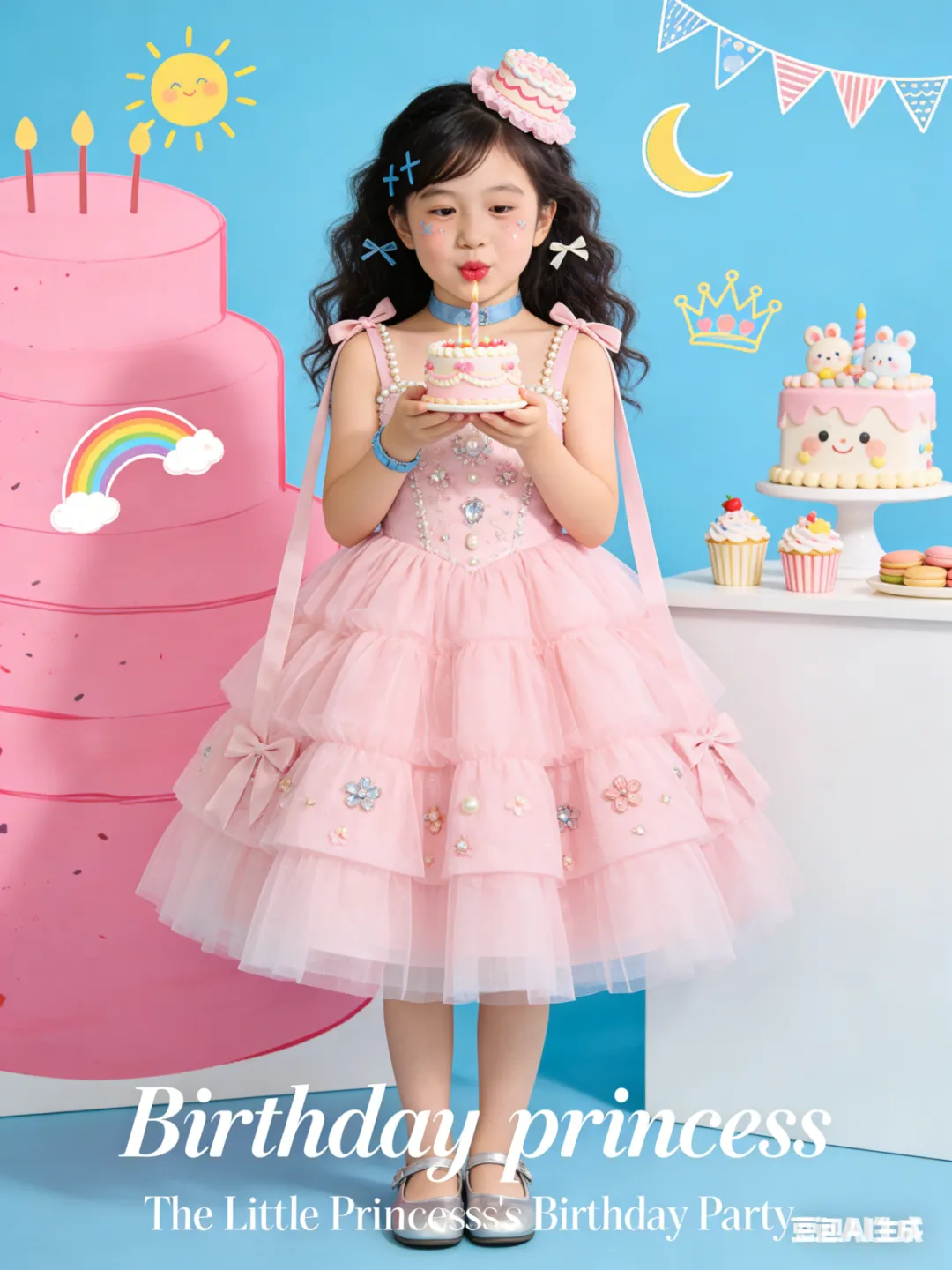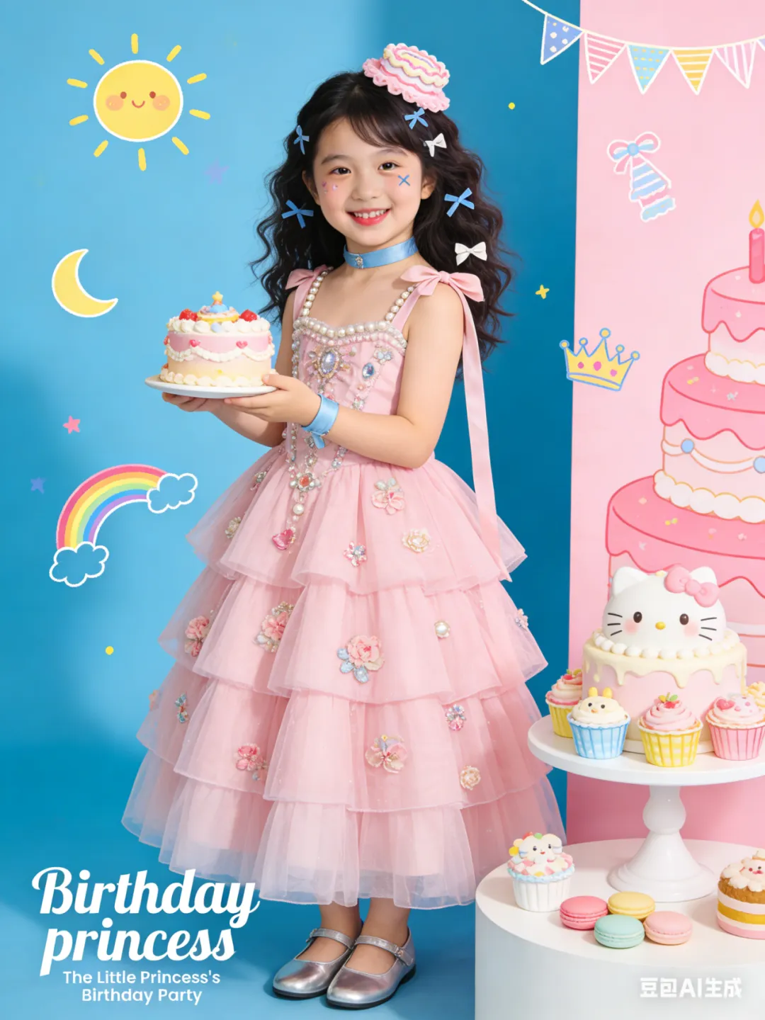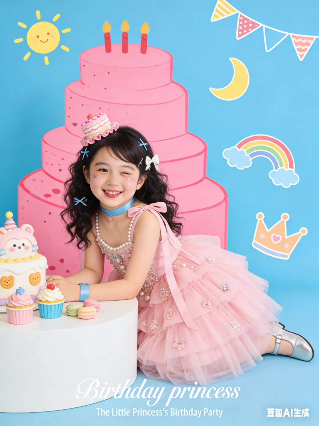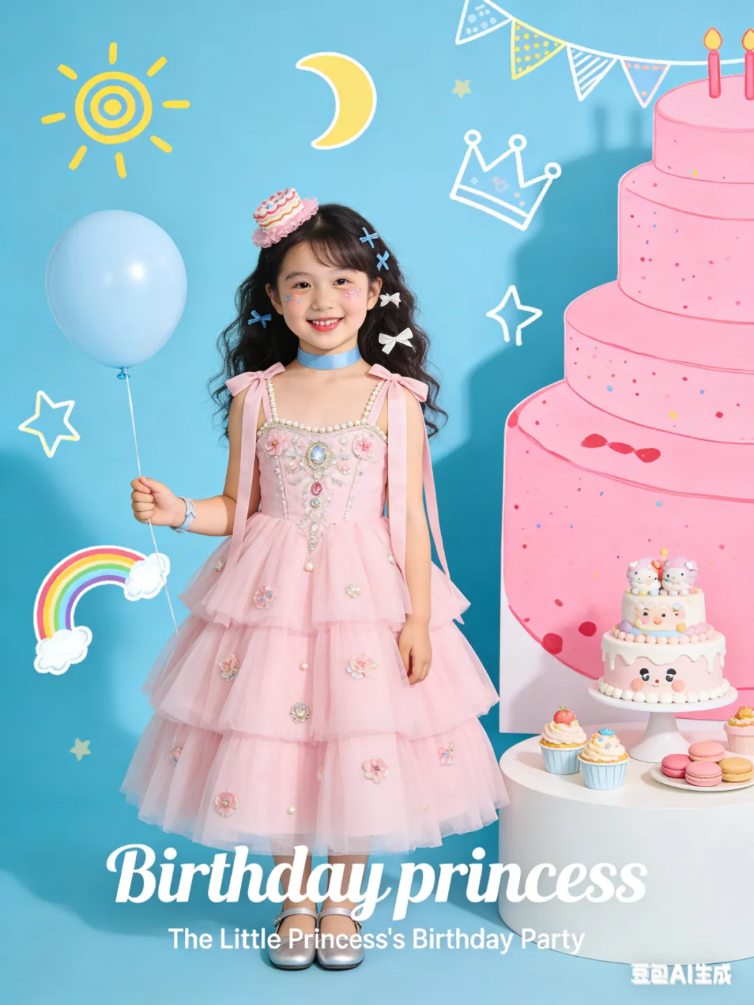 帮我生成 5 张 3:4 高清儿童写真,1:1 锁死原图 8 岁东亚小女孩五官、脸型、神态,面部零扭曲、零 AI 失真、零过度磨皮,保留真实皮肤纹理,气质俏皮灵动,笑容元气。妆容:清透甜妹妆,脸颊蓝叉、粉钻、爱心亮片,粉嫩腮红,水润红调唇色,无浓妆感。造型:元气蓬松半披发羊毛卷,空气感斜刘海,用多个蓝色十字发夹/白色蝴蝶结发夹点缀,侧头顶戴粉色洛丽塔风蛋糕边夹;服饰:高定粉色多层蓬蓬纱吊带A字蛋糕长裙,重工立体小花朵、水钻、珍珠装饰,肩带蝴蝶结长飘带,领口珍珠镶边;水蓝色缎带choker、腕带,银色小皮鞋,手持浅蓝色气球、仿真蛋糕 / 切片,道具质感真实。场景:天蓝色影棚背景,叠加手绘太阳、月亮、彩虹、皇冠、拉旗;1 米高粉色蛋糕背景板,纯白甜品台(摆放卡通立体蛋糕、纸杯蛋糕、马卡龙),营造生日氛围;画面点缀「Birthday princess」「The Little Princess's Birthday Party」艺术字,不遮挡人物。动作:持气球站立、举蛋糕切片、托蛋糕特写、趴甜品台 wink、捧蛋糕吹蜡烛造型。光影:真实影楼柔光侧光,粉蓝撞色,色彩明快,8K 超高清,细节拉满(纱裙蓬松、道具真实、皮肤质感 100% 还原),无 AI 感,生日氛围感拉满。负面提示:模糊,五官变形,比例失调,服饰失真,过度磨皮,AI 感重,光影虚假,纱裙塌陷,道具失真。