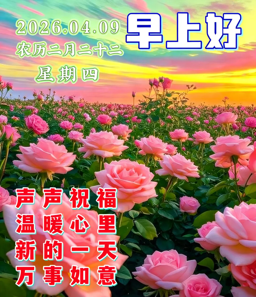 当前位置:首页>美女资讯>4月9日-周四早安漂亮图片祝福语+愿你我:天天开心,快乐到老.早上好!