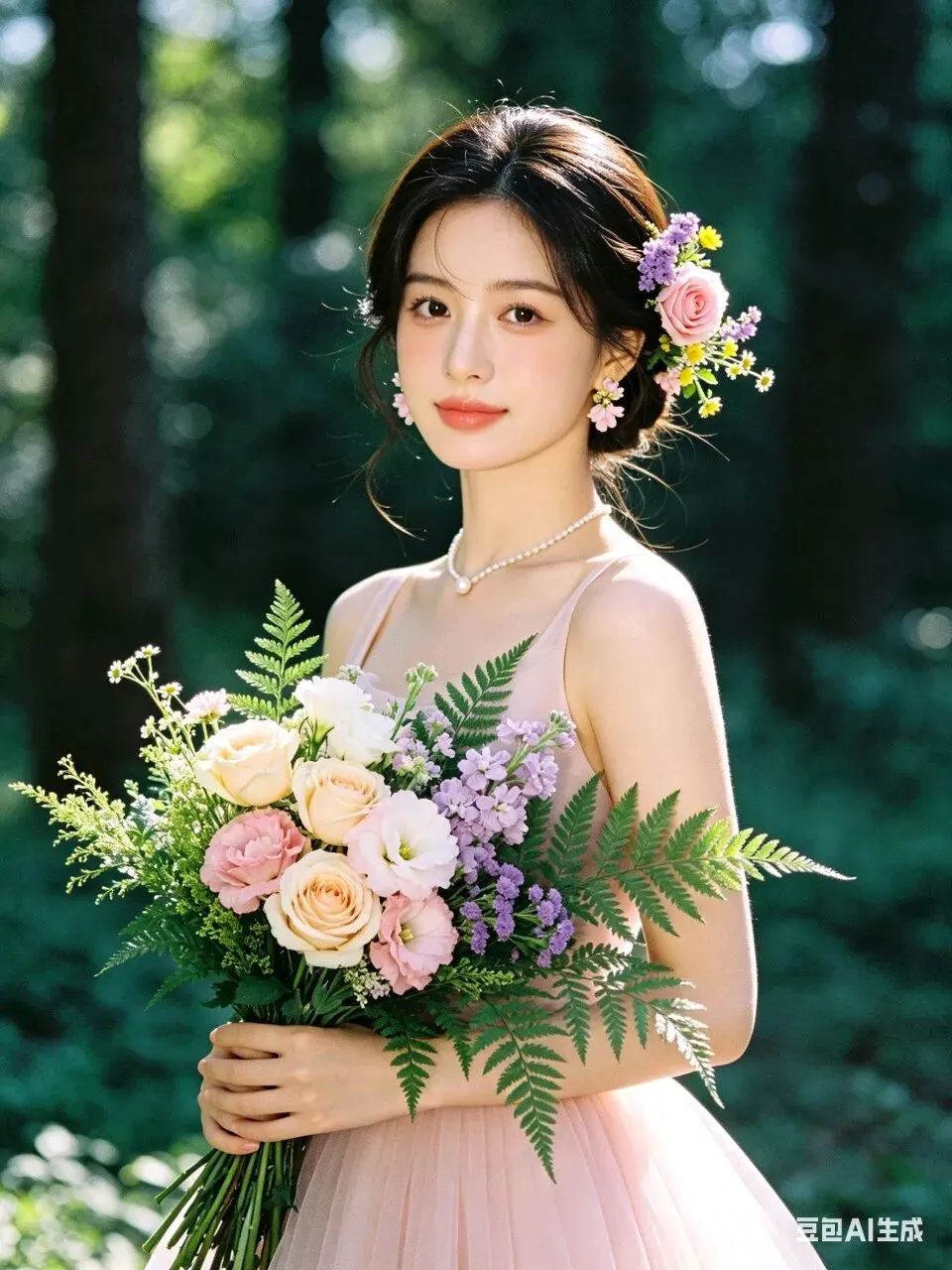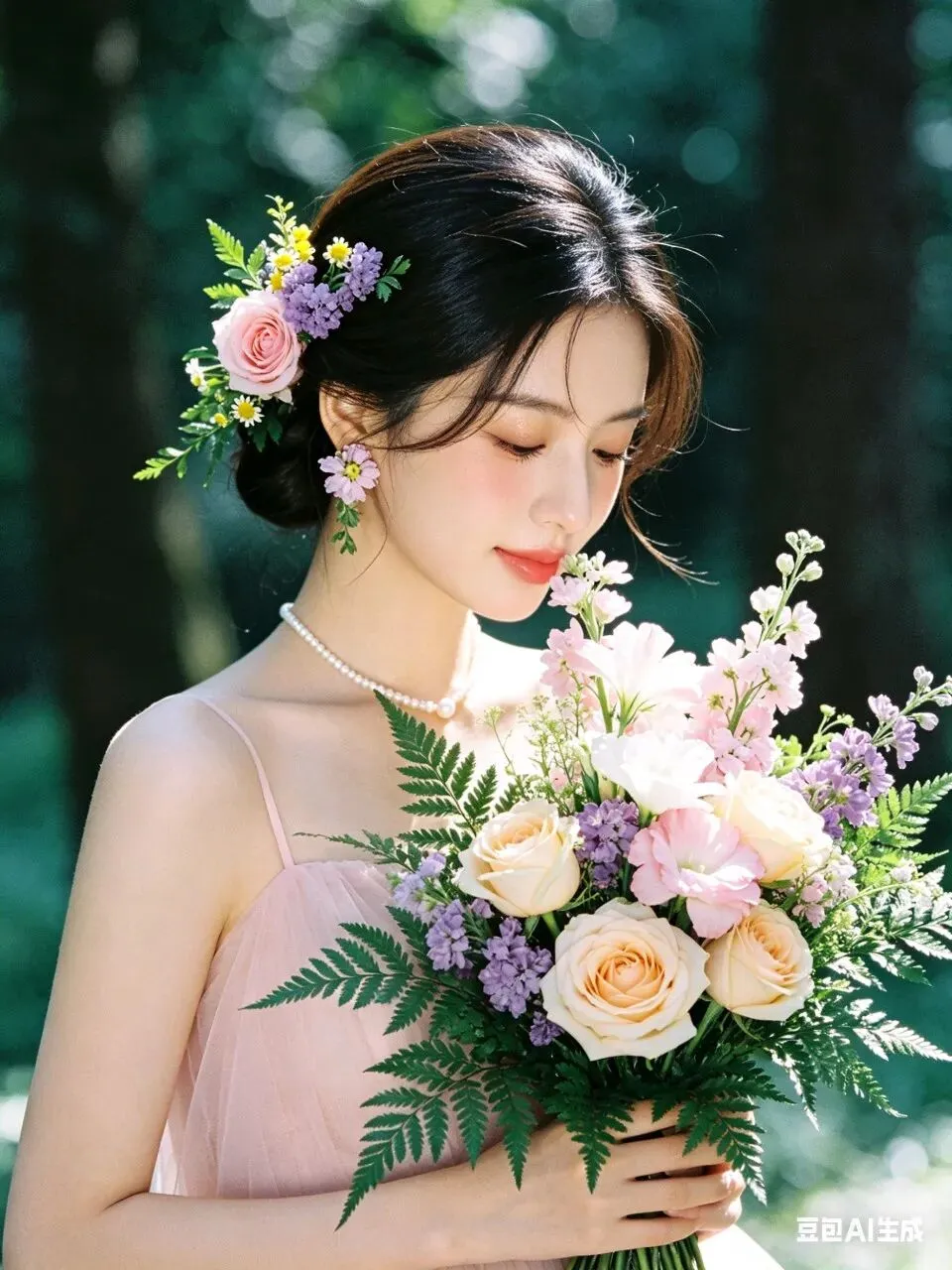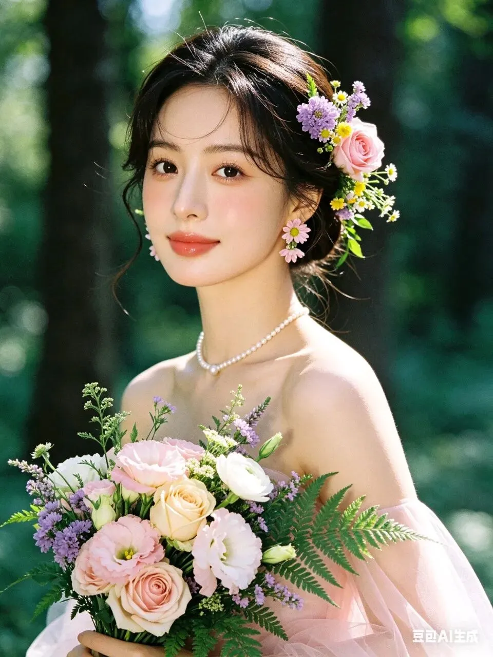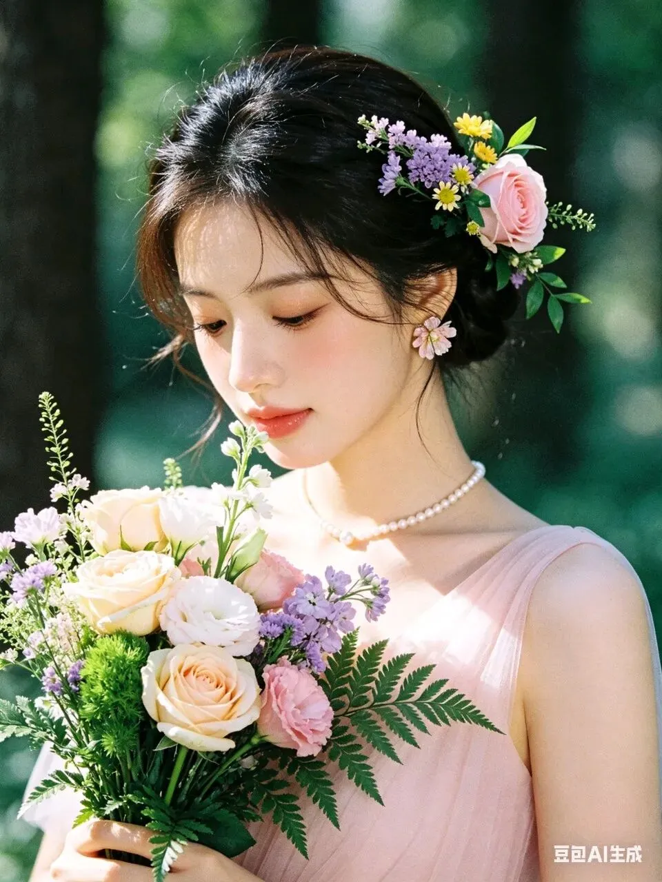 人物身着简约无袖浅粉色轻纱礼服,颈间佩戴单颗极简珍珠项链,完美勾勒精致肩颈线条;耳饰为鲜活鲜花造型,发型是柔顺光亮的低盘发,一侧鬓角编发缠绕粉色玫瑰、紫色勿忘我、黄色小雏菊与鲜绿枝叶,与手捧花形成视觉呼应。妆容为清透伪素颜高级感妆造,底妆服帖通透,眼妆以大地色晕染打底,卧蚕提亮凸显灵动双眸,唇妆是温柔蜜桃豆沙色,脸颊轻扫淡粉腮红,自然提气色。