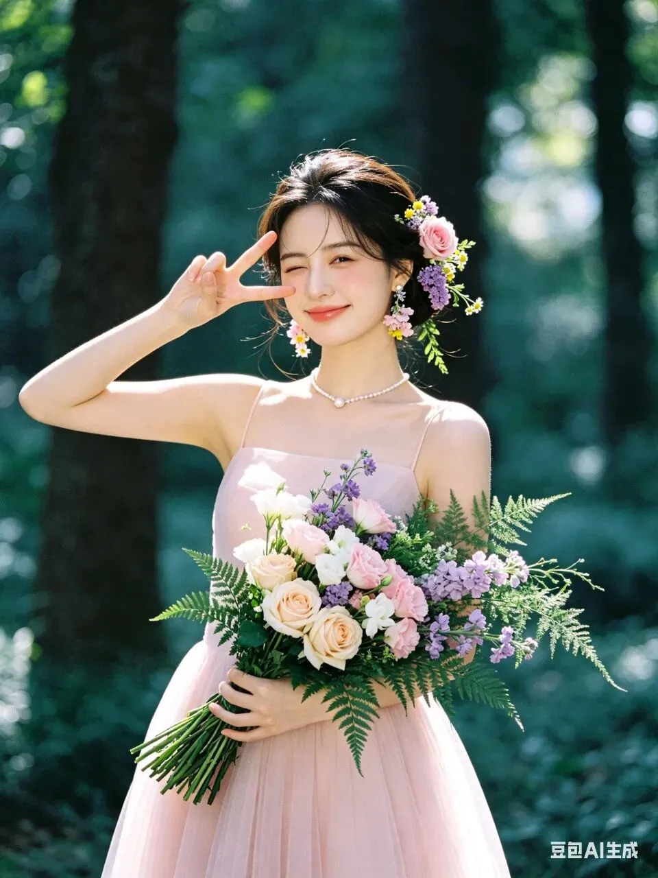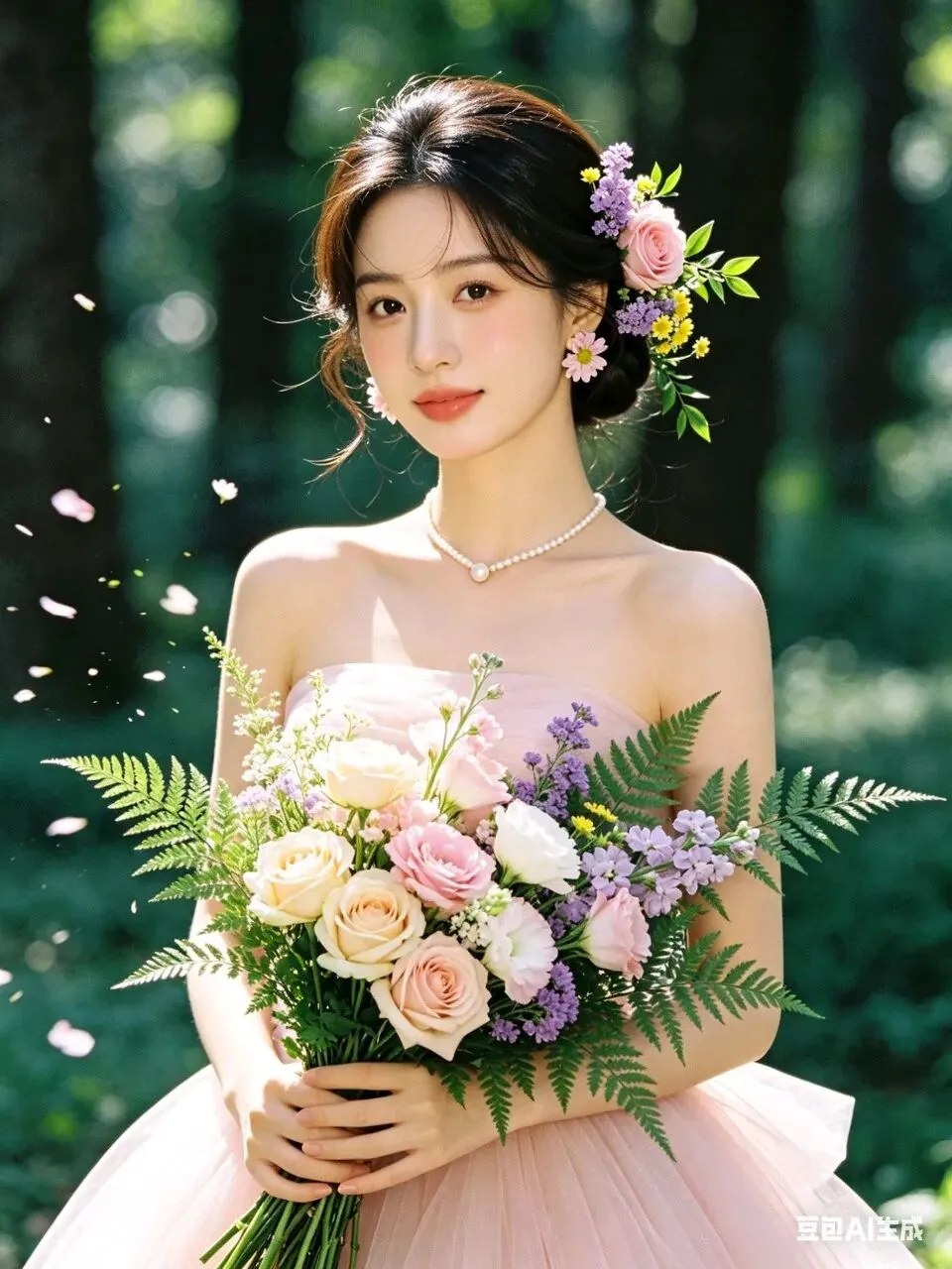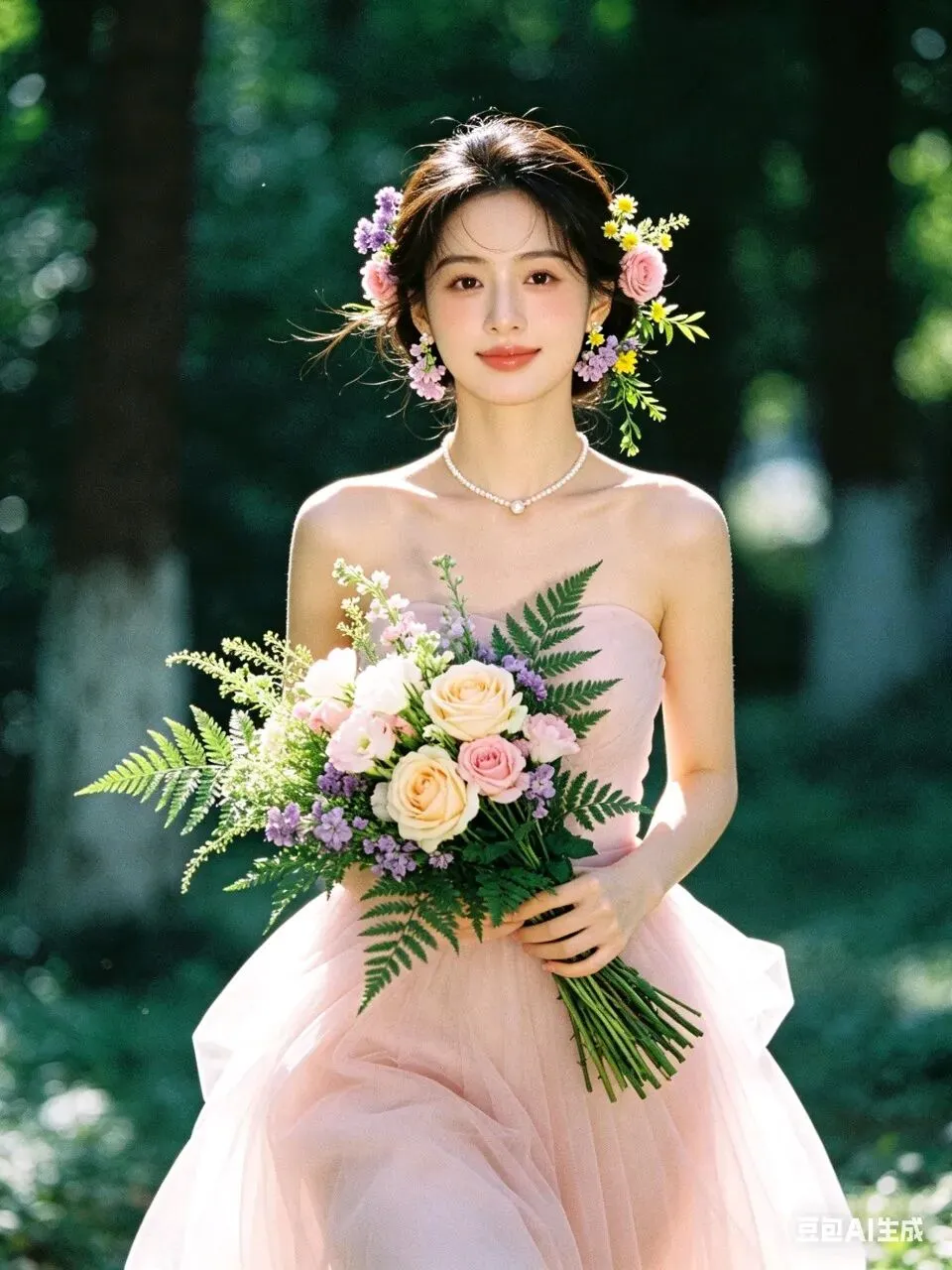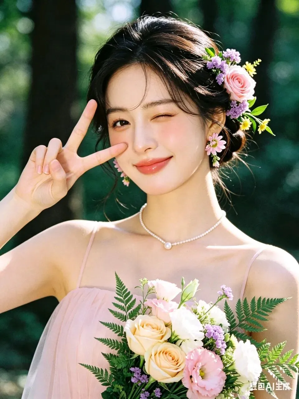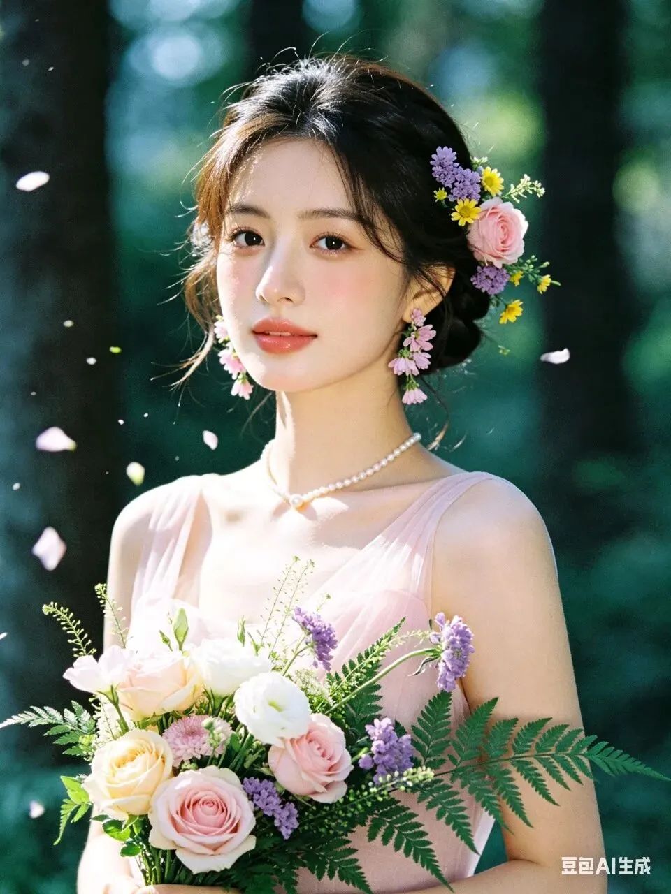 人物身着简约无袖浅粉色轻纱礼服,颈间佩戴单颗极简珍珠项链,完美勾勒精致肩颈线条;耳饰为鲜活鲜花造型,发型是柔顺光亮的低盘发,一侧鬓角编发缠绕粉色玫瑰、紫色勿忘我、黄色小雏菊与鲜绿枝叶,与手捧花形成视觉呼应。妆容为清透伪素颜高级感妆造,底妆服帖通透,眼妆以大地色晕染打底,卧蚕提亮凸显灵动双眸,唇妆是温柔蜜桃豆沙色,脸颊轻扫淡粉腮红,自然提气色。
