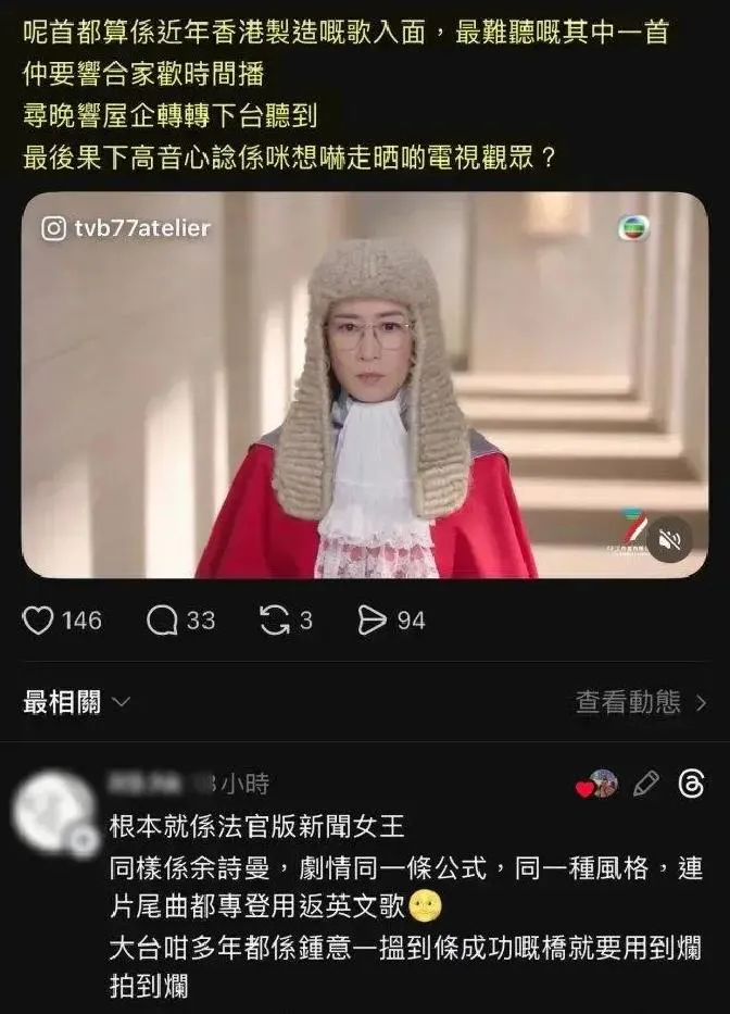 更绝的是,剧方还犯了个“心机”错误:明明谷娅溦的广东话版更贴合剧情,却偏爱英文版。这操作,让观众骂得更狠。有老观众直呼:“以前《新闻女王》用谷娅溦唱主题曲,听得人想哭。这次用吕乔恩,只想逃!”