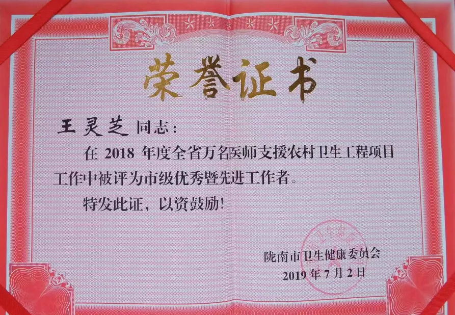 帮扶期间,她工作踏实、表现突出,先后荣获陇南市政府“健康帮扶优秀工作者”及礼县第一人民医院“先进工作者”称号。2020年底,河西学院附属张掖人民医院还授予她“十佳组团帮扶之星”。