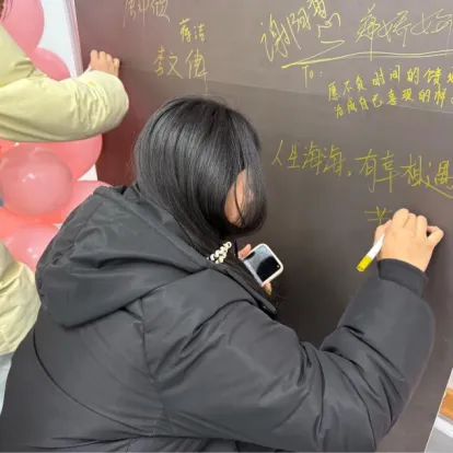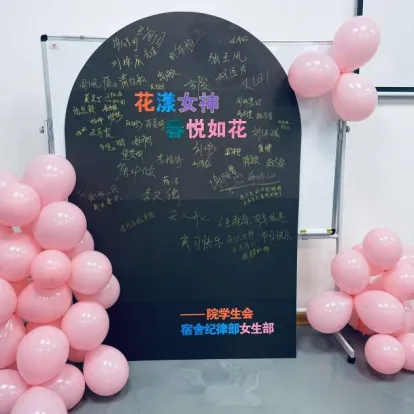 活动以“创意签名墙”启幕,女生们用金色丙烯笔在KT板上书写祝福与心愿,并拍照打卡留念。缤纷的签名与笑脸交织,成为春日校园的独特记忆。