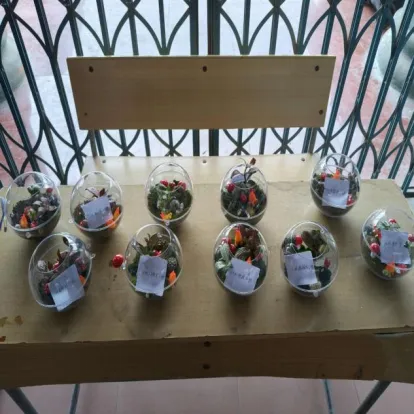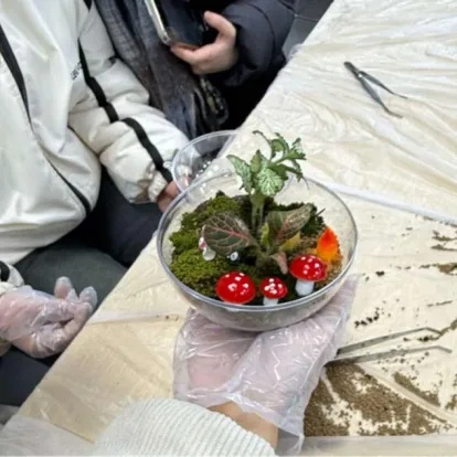 压轴环节中,各班女生分组创作微景观瓶与花艺作品。绿植、苔藓、卡通摆件与鲜花在指尖巧妙组合,一件件充满巧思的作品跃然眼前。优秀作品将于教学楼展览,传递“小而美”的生活哲学。
