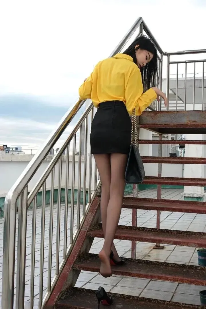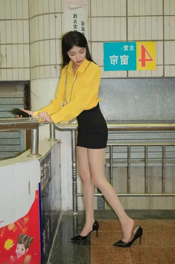走进室内店铺,踏着阶梯走动的时候,黄色的衬衫在暗色的环境下格外醒目。在台阶上的广告贴纸随意自然地存在,使穿搭更接地气。