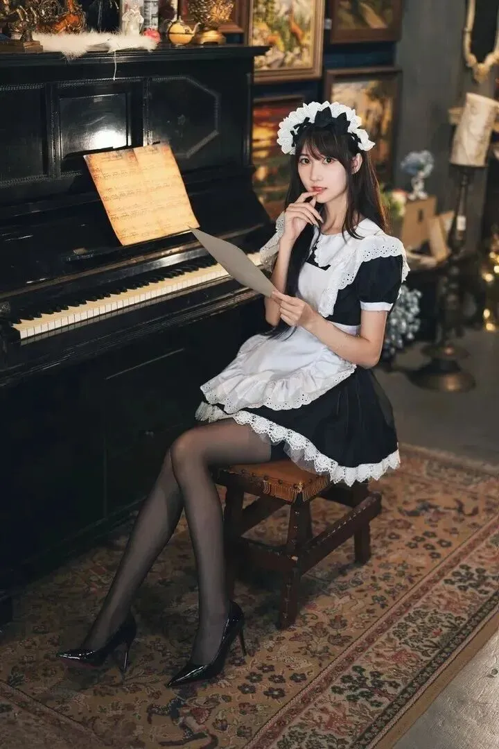阳光轻轻地照到那架老钢琴上。女孩子在琴凳上坐下以后,在乐谱前轻轻地点了一下自己的手指之后才开始弹奏。她那身女仆服,并不是随意穿的,是带有怀念过去的意思。黑色连衣裙是以棉质为原料制成的服装,在朴素中带有一些典雅的风格。领口和袖口用白色的蕾丝装饰得像花瓣一般,层层叠开。